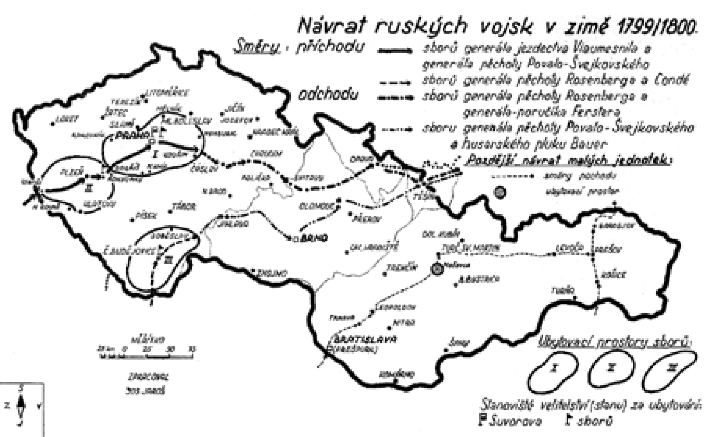 Маршруты следования русских корпусов во время возвращения из Итальянского похода 1799 года. Для наглядности маршруты движения войск спроецированы на карту Чехословакии