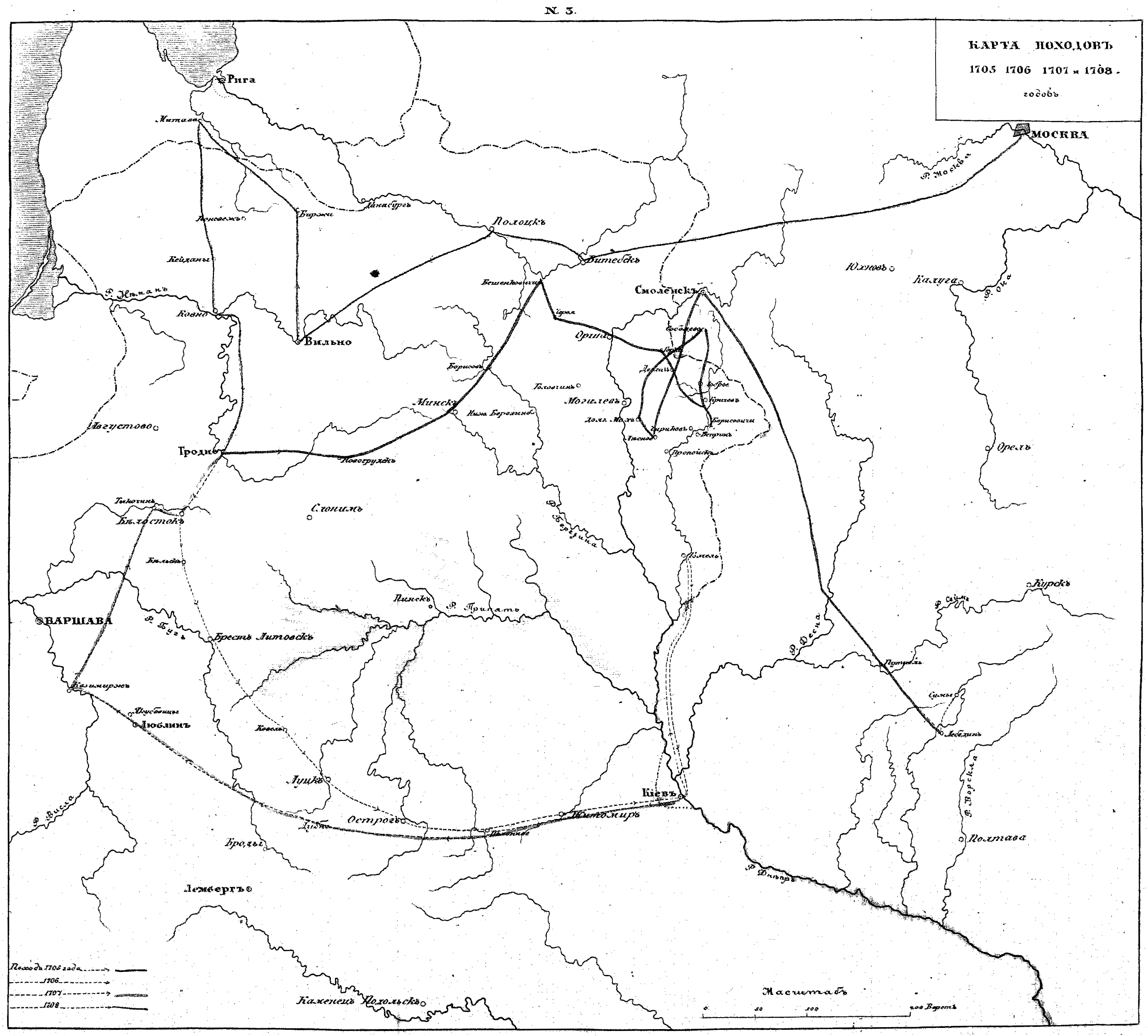 Карта походов 1705, 1706, 1707 и 1708 годов.