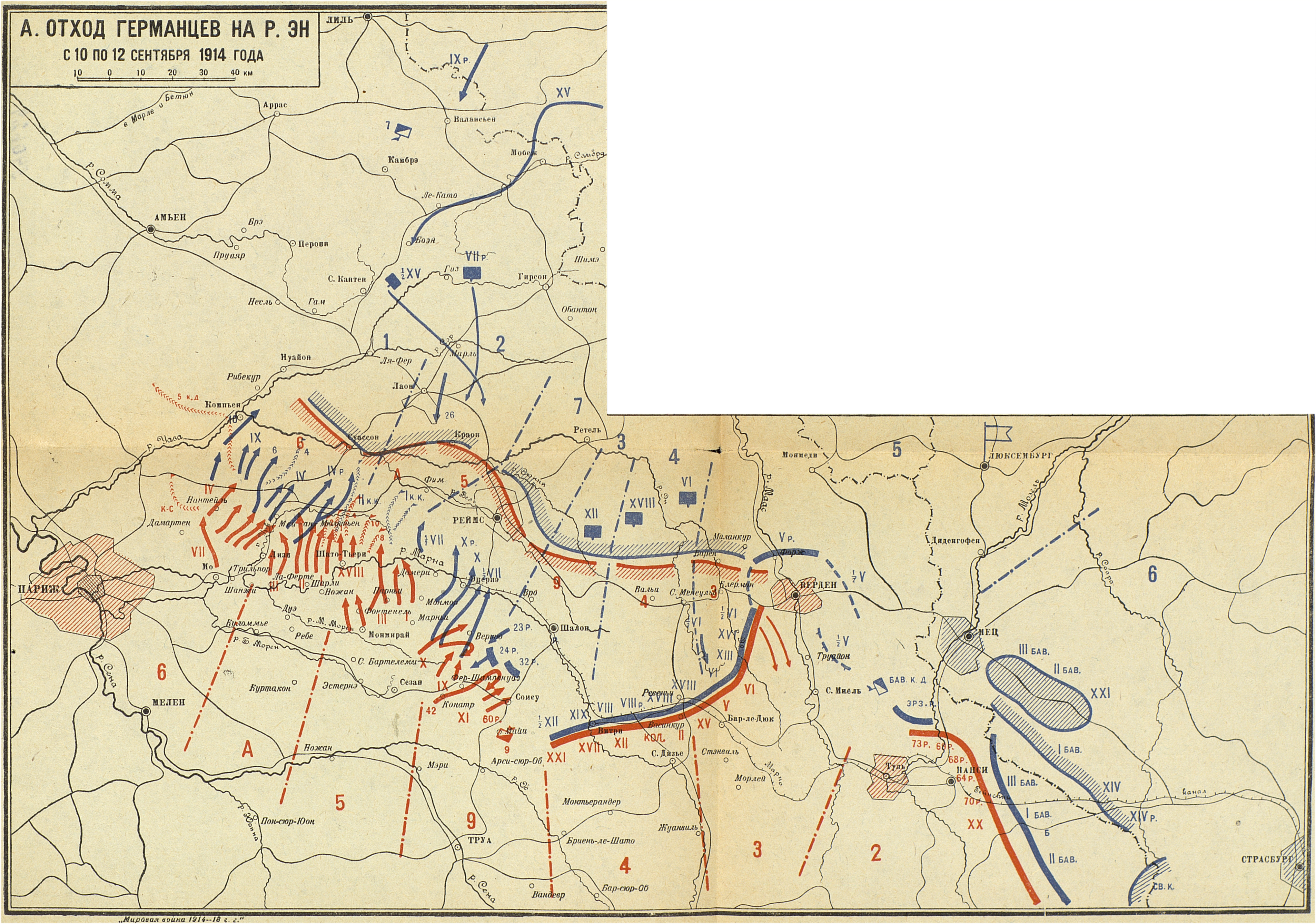 Кампания 1914 года. Французский театр. А. Отход германцев на реке Эн с 10 по 12 сентября. Б. Сражение на реке Эн с 13 по 15 сентября