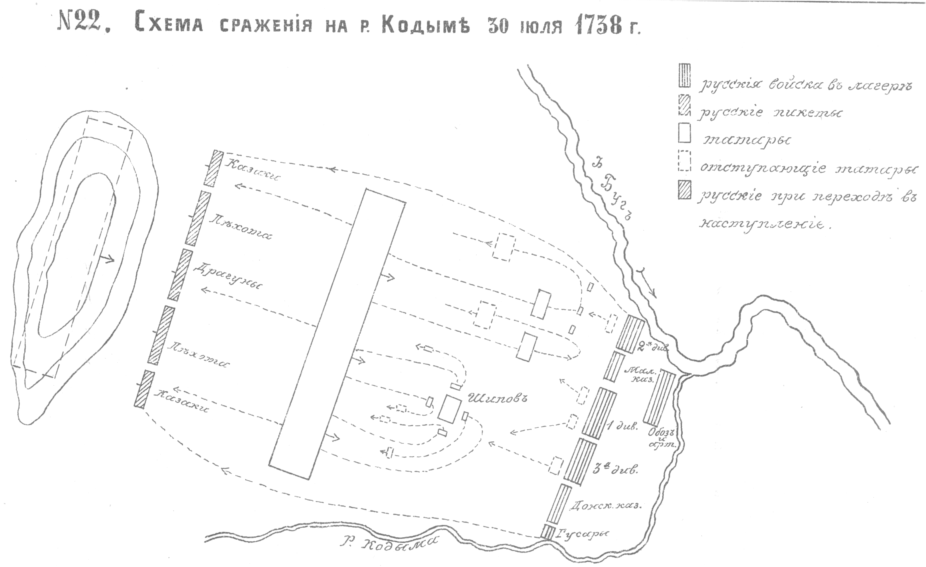 На карте опечатка: сражение произошло 30 июня 1738 года <div id="imgunder"><a href="http://www.runivers.ru/bookreader/book16971/#page/559/mode/1up">Читать о сражении подробнее в издании: Байов Алексей Константинович. Русская армия в царствование императрицы Анны Иоанновны. Война России с Турцией в 1736-1739гг. Том I. Первые три года войны.— СПб., 1906.</a></div>