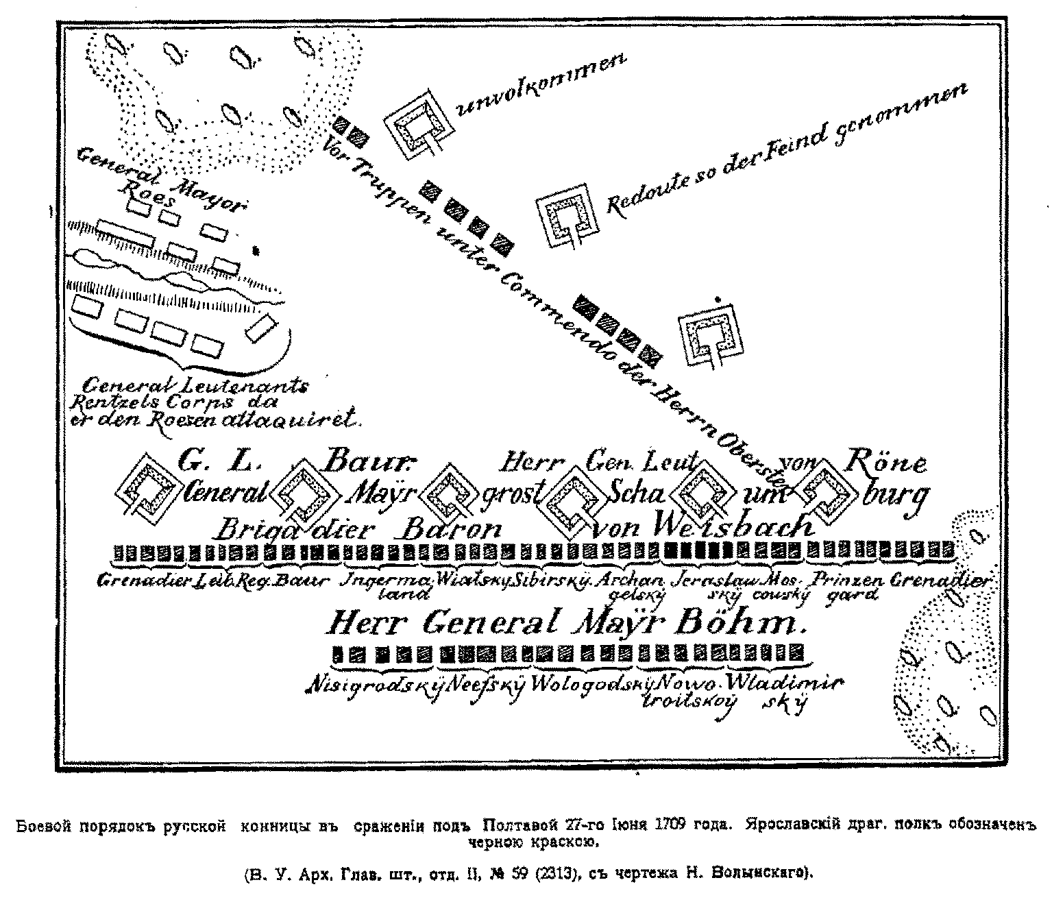 Боевой порядок русской конницы в сражении под Полтавой 27 июня 1709 года. Ярославский драгунский полк обозначен черной краской. (Военный Ученый Архив Главного Штаба, отд.II, №59, с чертежа Н.Волынского)