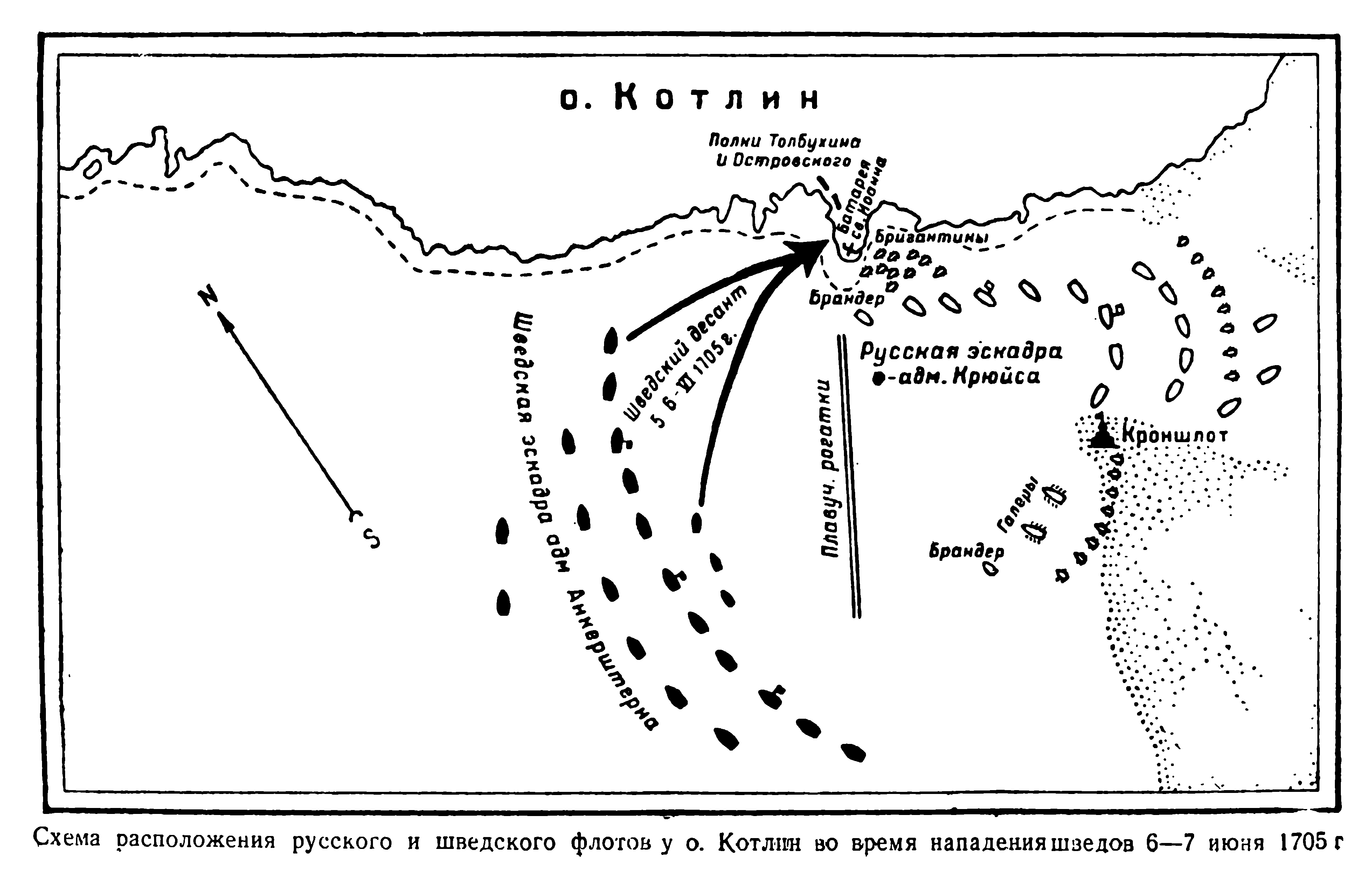 Расположение русского и шведского флотов у острова Котлин во время нападения шведов 6-7 июня 1705 года