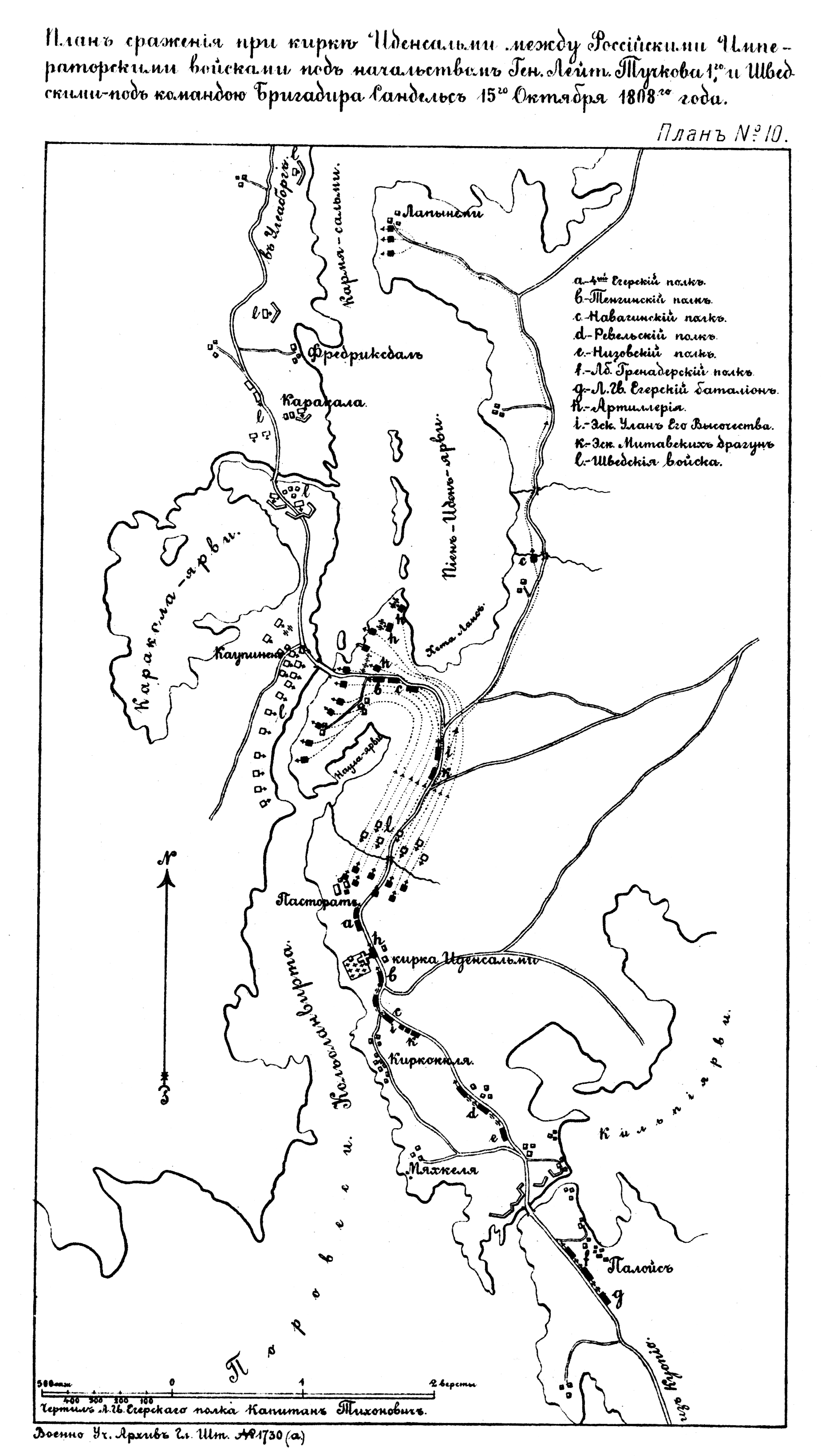 План сражения при кирке Иденсальми между Российскими Императорскими войсками под начальством Генерал-лейтенанта Тучкова 1-го и Шведскими - под командой Бригадира Сандельс 15 октября 1808 года
