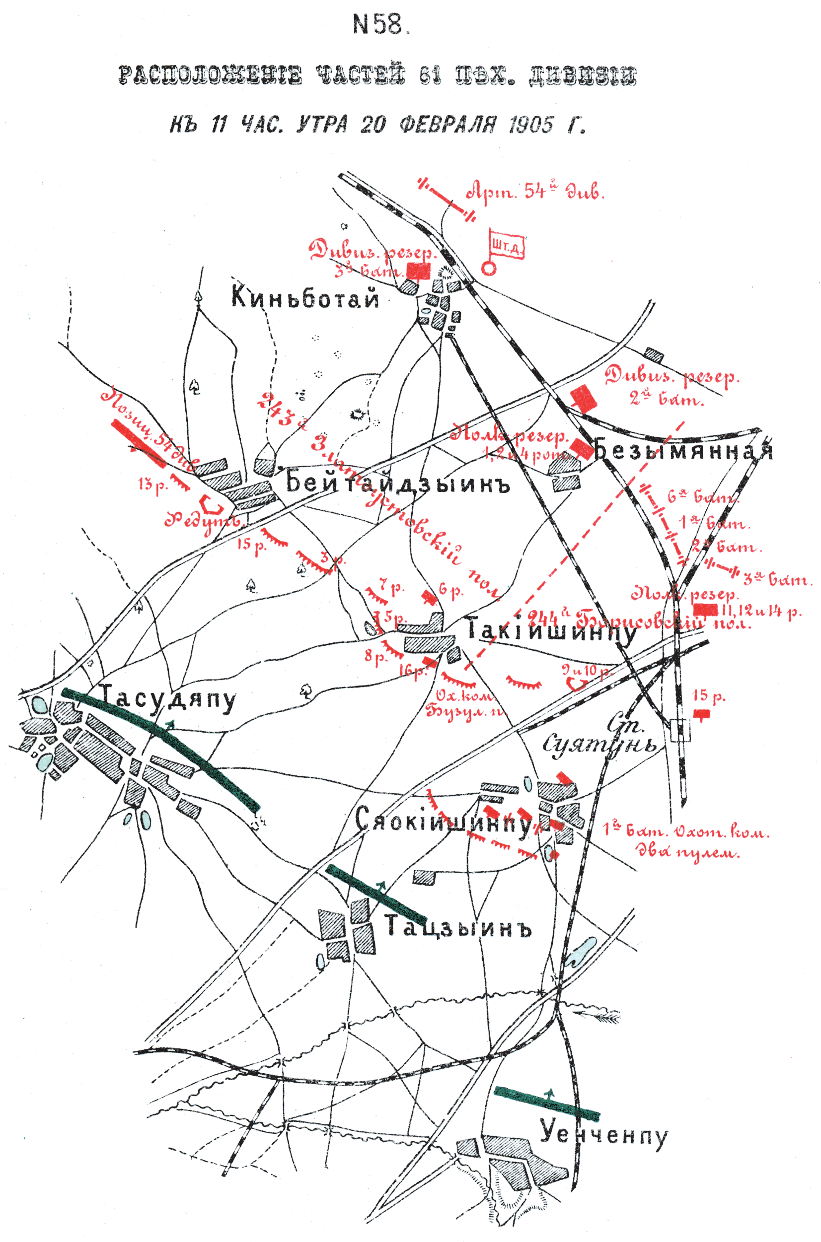 Расположение частей 61 пехотной дивизии к 11 часам утра 20 февраля 1905 года