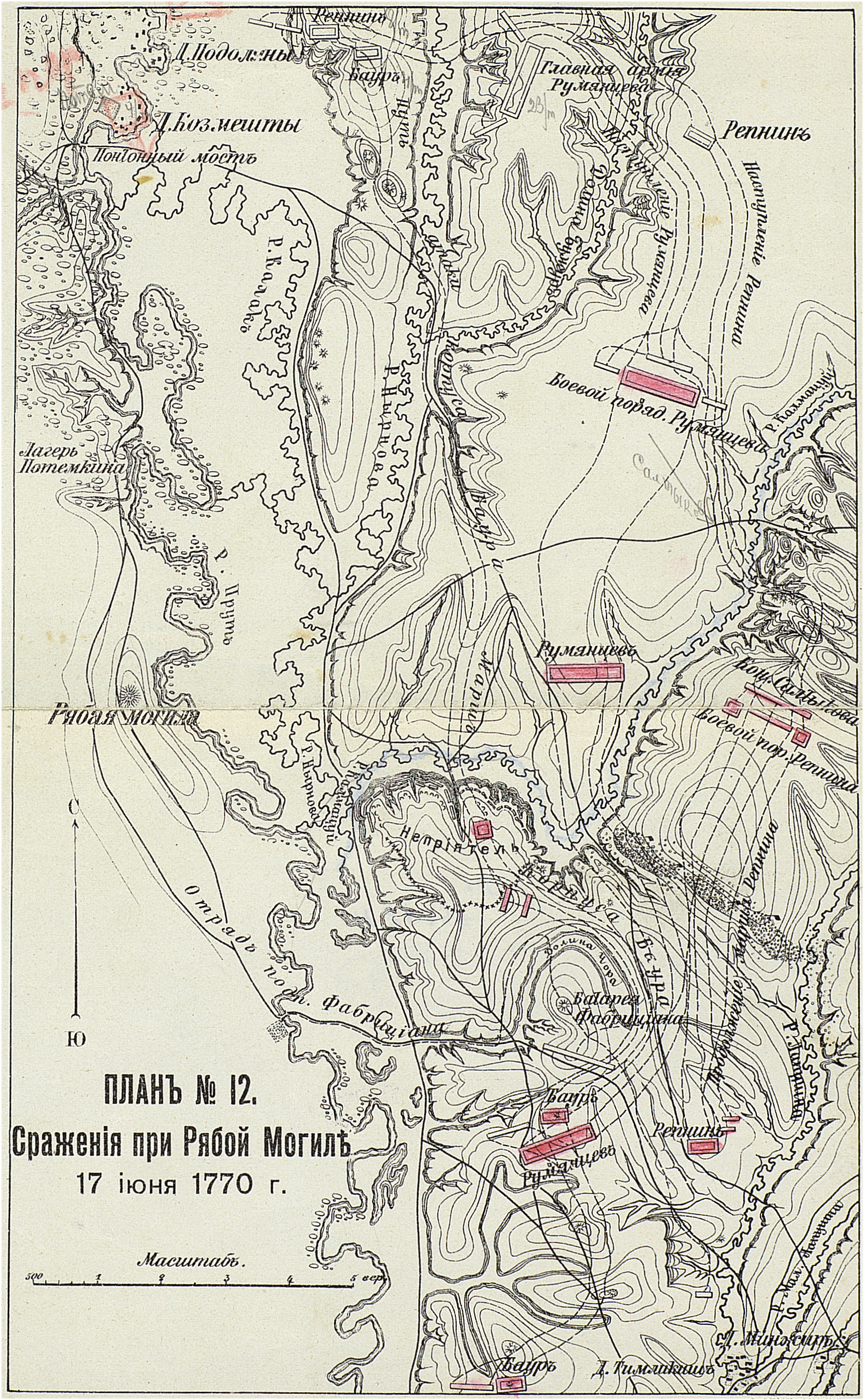 Прибыв к Рябой Могиле и решив атаковать противника, который занимал сильную позицию против этого урочища, Румянцев тотчас начал подготовку к бою. С этой целю он прежде всего озаботился тем, чтобы, производя разведку о противнике, самому не обнаруживать себя. В этих видах он приказал начальнику передовых войск, Репнину, принять меры к тому, чтобы «неприятель никак не мог проникнуть, на котором берегу Прута наши войска умножены или уменьшены»…