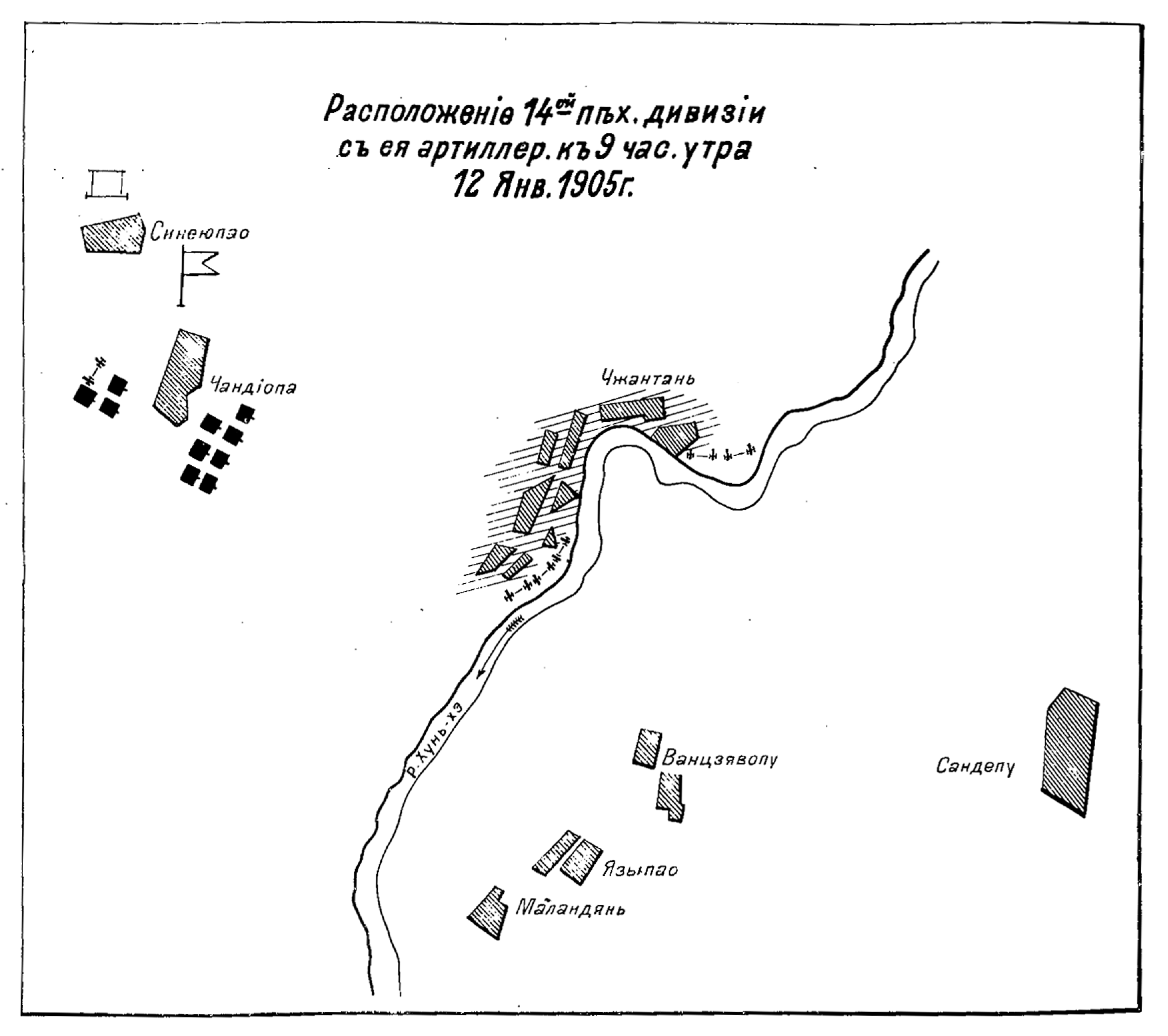 Расположение 14-ой пехотной дивизии с ее артиллерией к 9 часам утра 12 января 1905 года