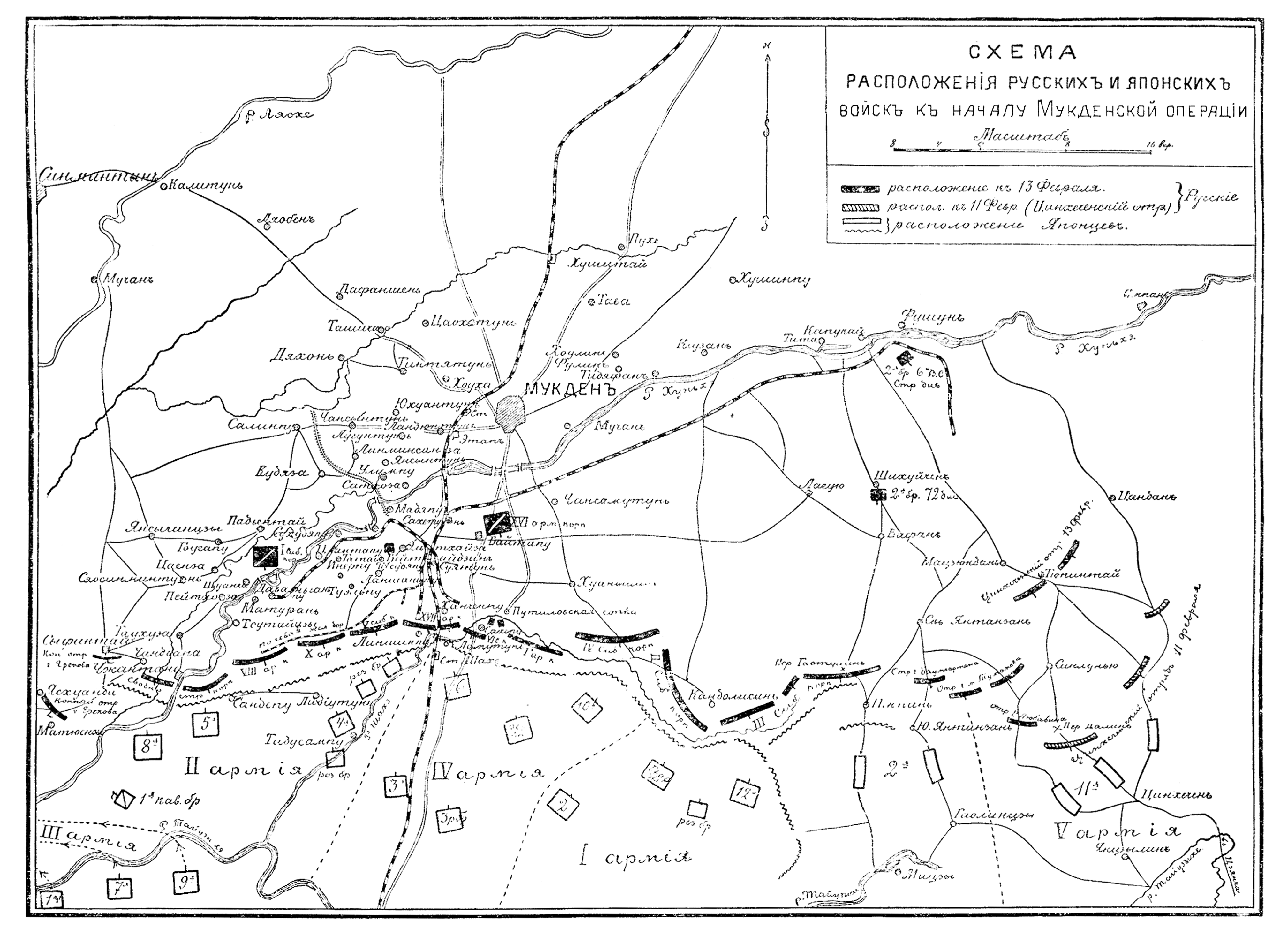 Схема расположения русских и японских войск к началу Мукденской операции