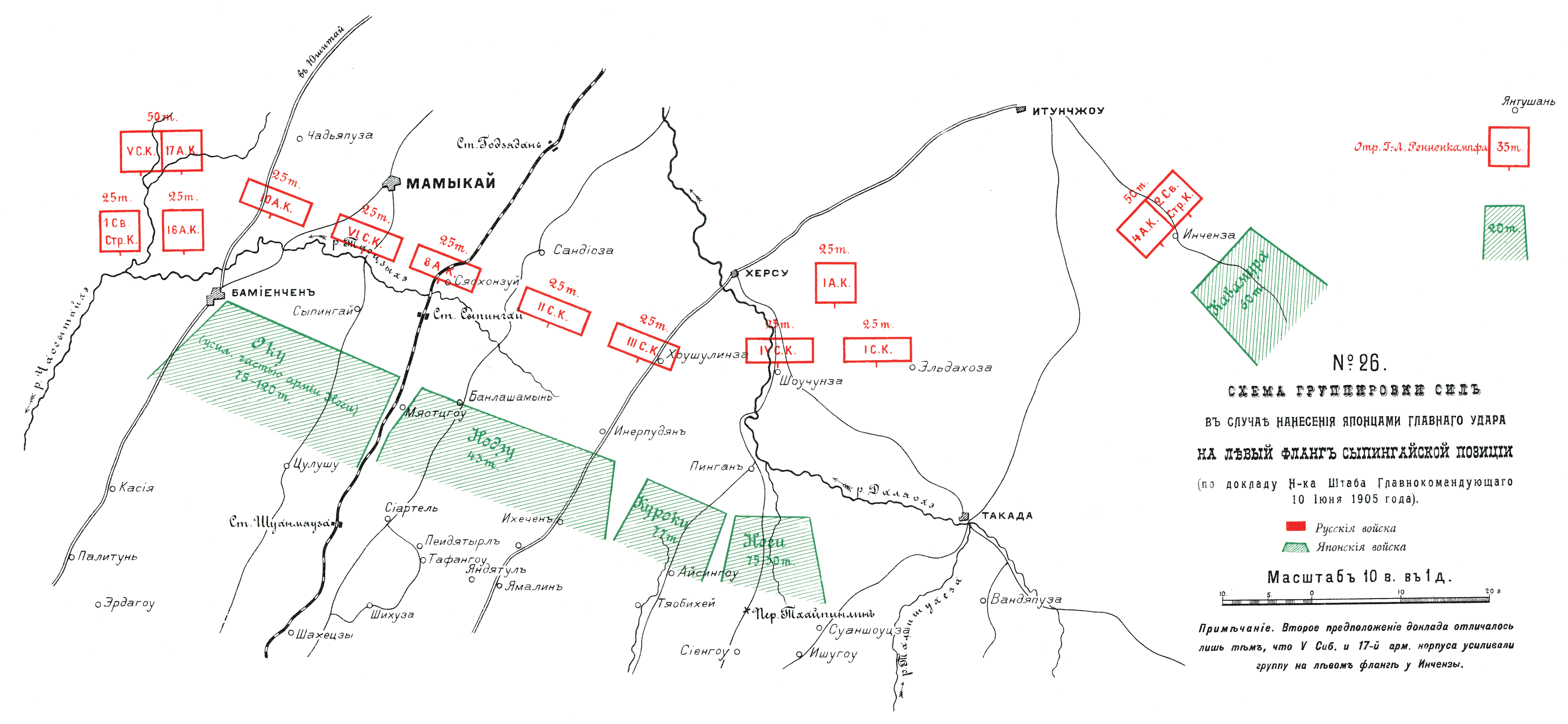 Группировка сил в случае нанесения японцами главного удара на левый фланг Сыпингайской позиции (по докладу Начальника Штаба Главнокомандующего 10 июня 1905 года)