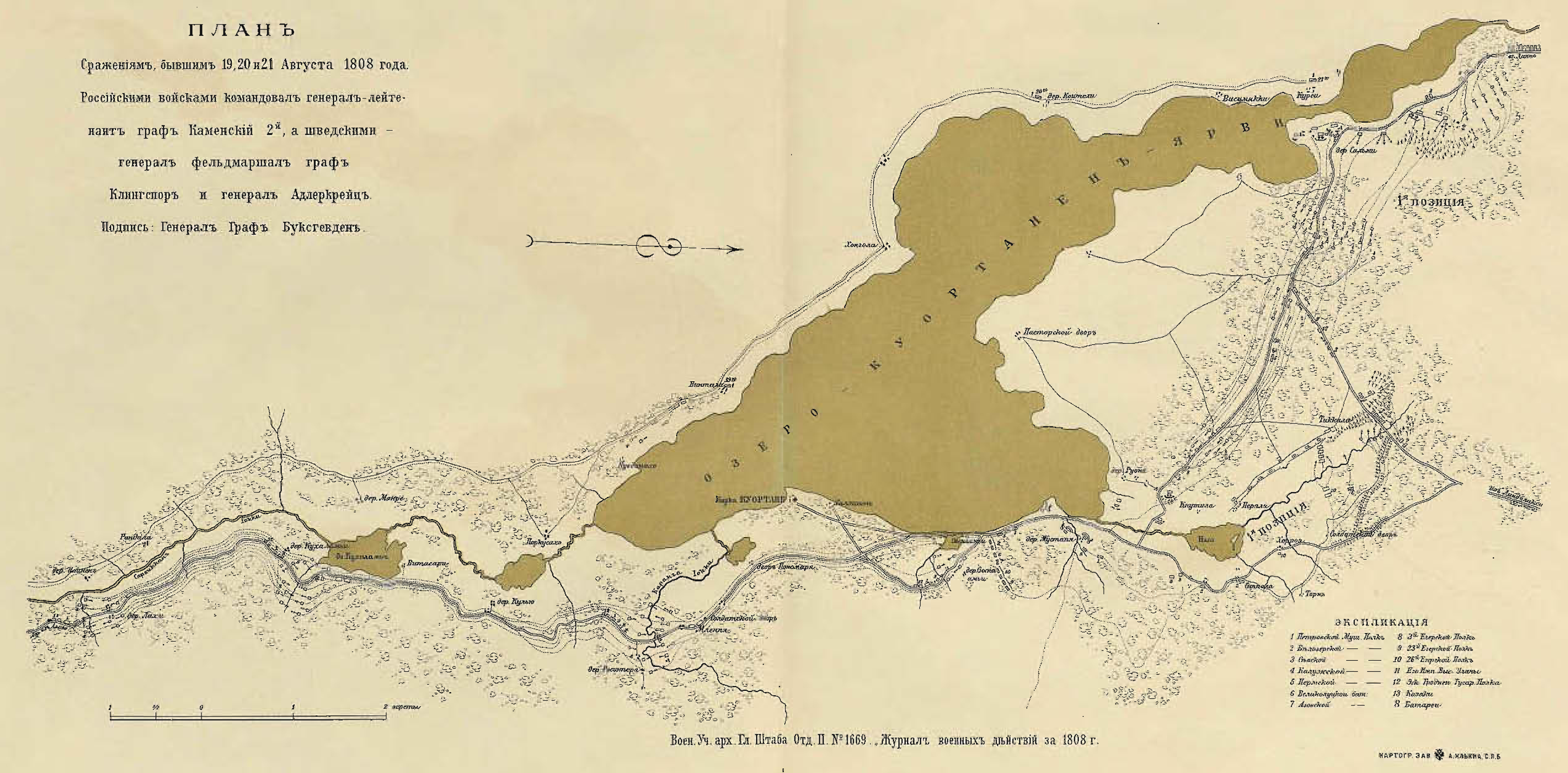 Сражения при озере Куортан, бывшие 19, 20 и 21 августа 1808 года. Российскими войсками командовал генерал-лейтенант граф Каменский 2-ой, а шведскими - генерал фельдмаршал граф Клингспор и генерал Адлеркрейц