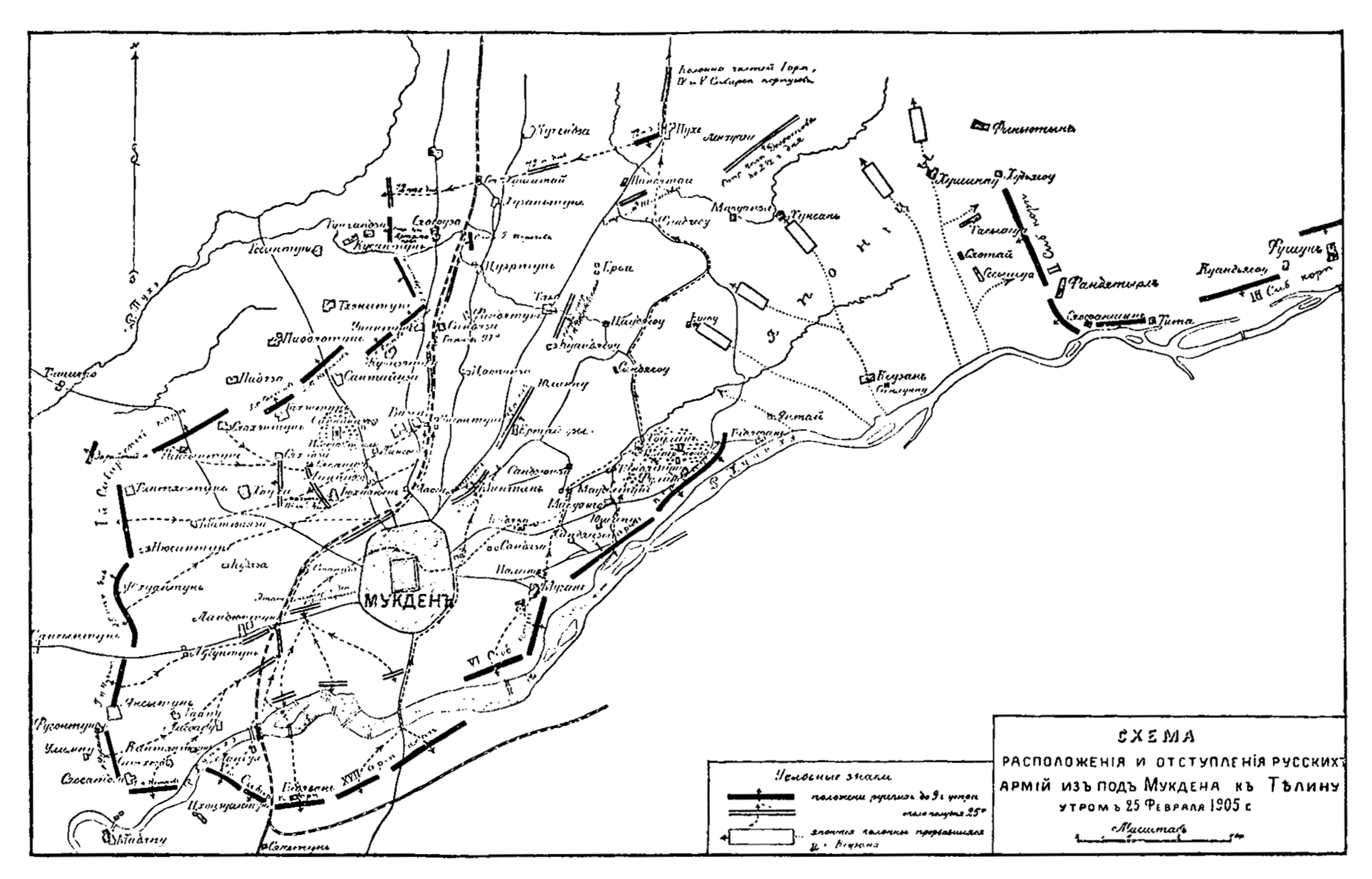 Схема расположения и отступления армий из-под Мукдена к Телину утром 25 февраля 1905 года
