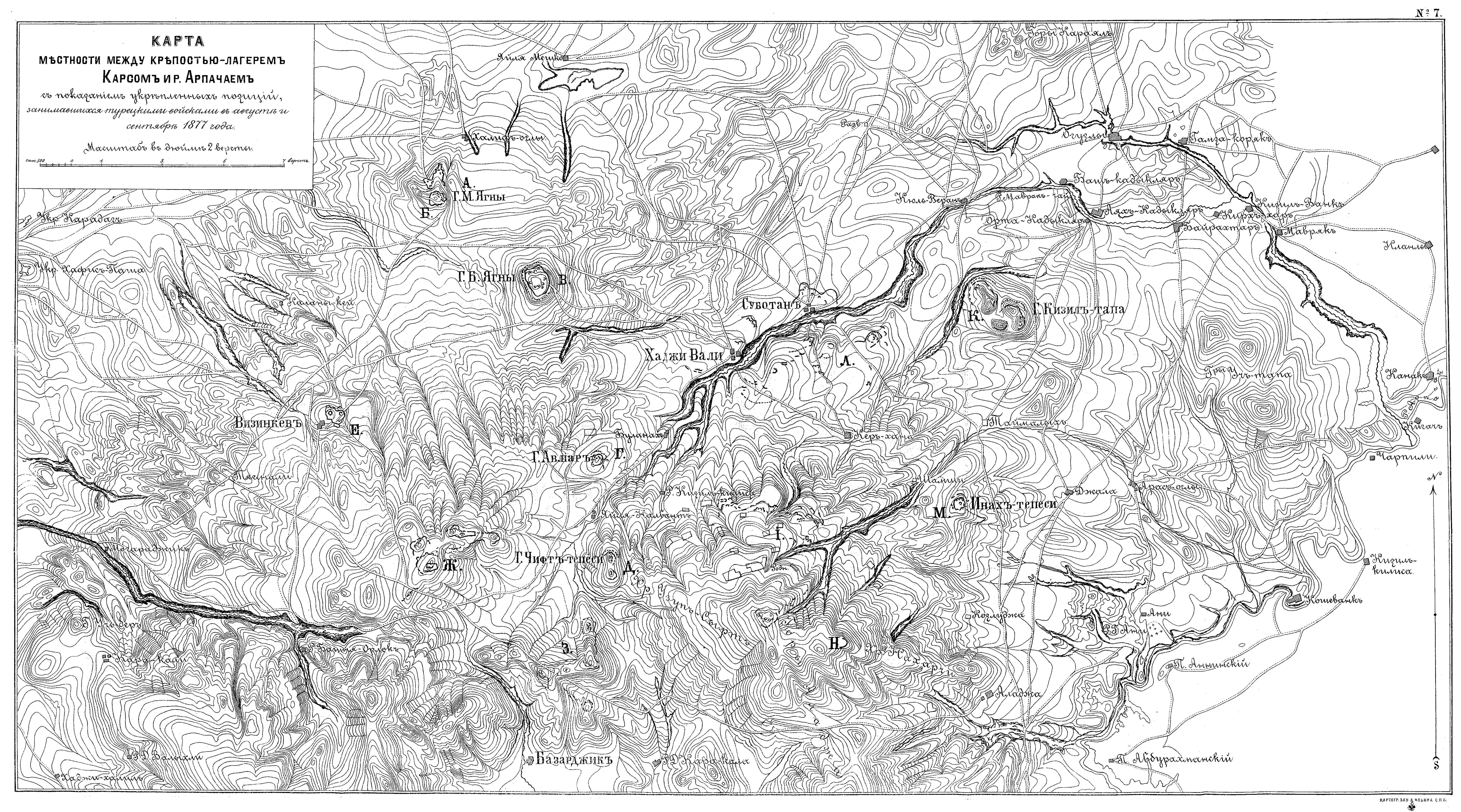 Местность между крепостью-лагерем Карсом и рекой Арпачаем, с показанием укрепленных позиций, занимавшихся турецкими войсками в августе и сентябре 1877 года