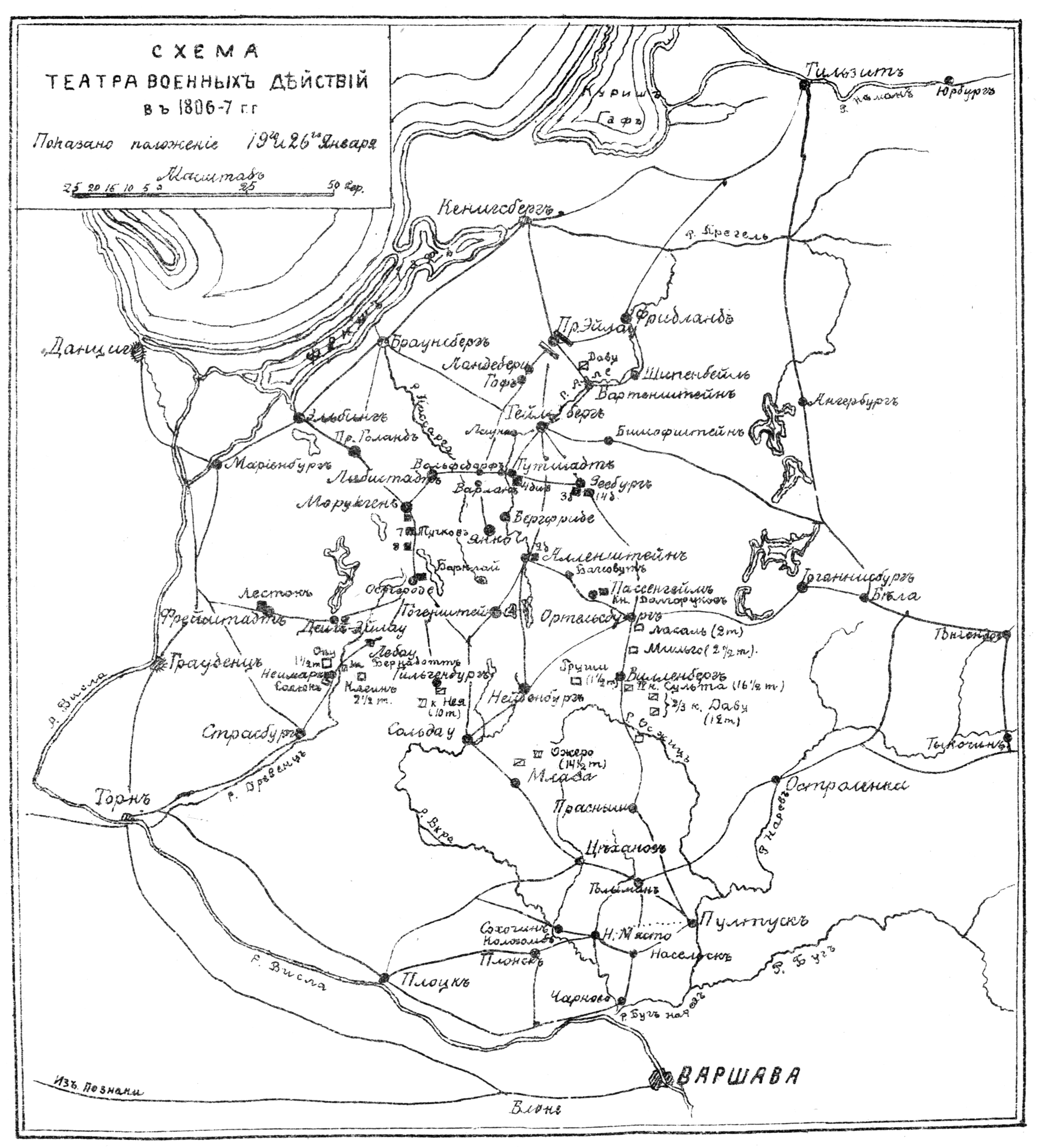 Театр военных действий в 1806-1807 годах. Показано положение 19 и 26 января