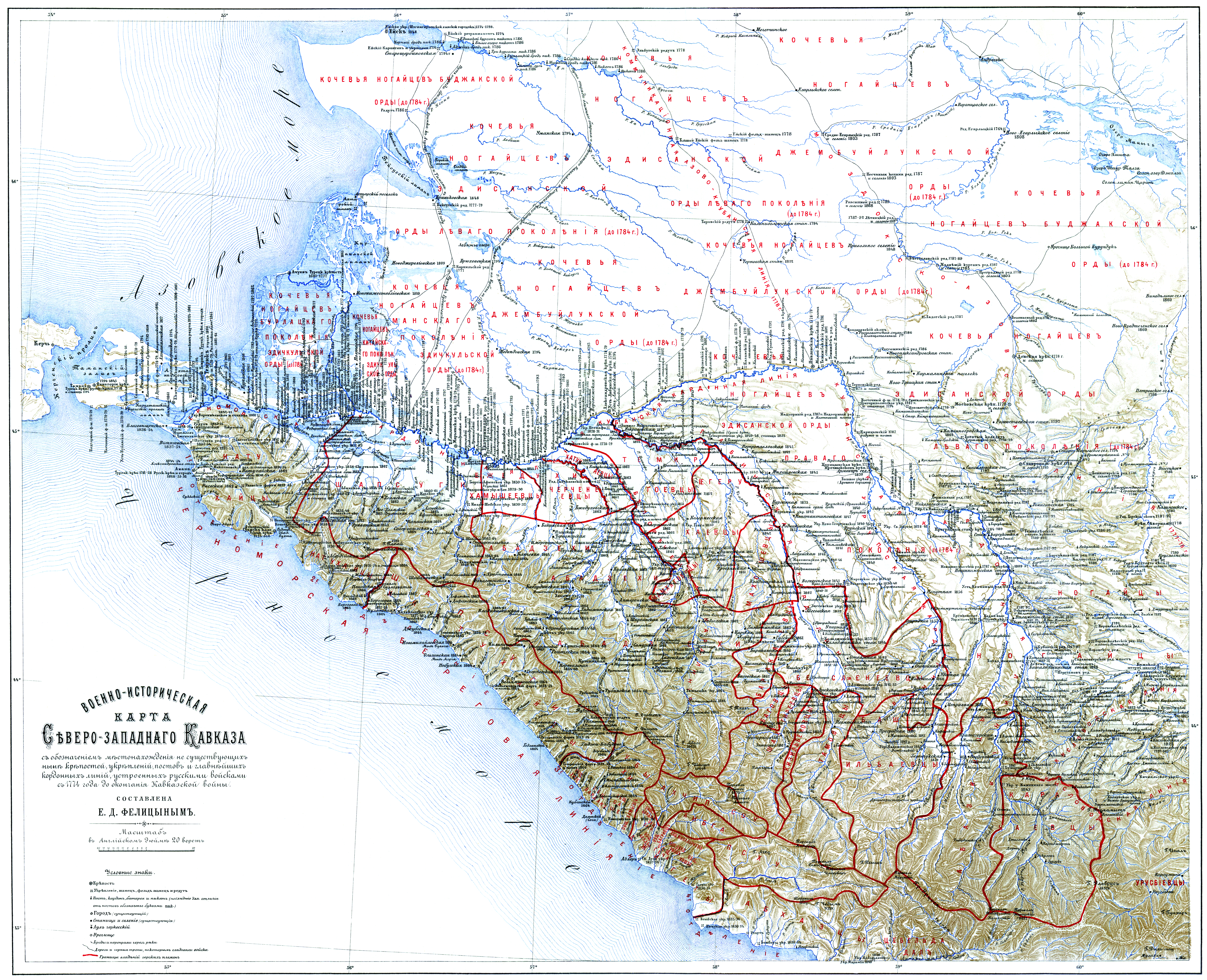 Военно-историческая карта Северо-западного Кавказа с обозначением местонахождения несуществующих ныне крепостей, укреплений, постов и главнейших кордонных линий, устроенных русскими войсками с 1774 года до окончания Кавказской войны. Составлена Е.Д.Фелицы