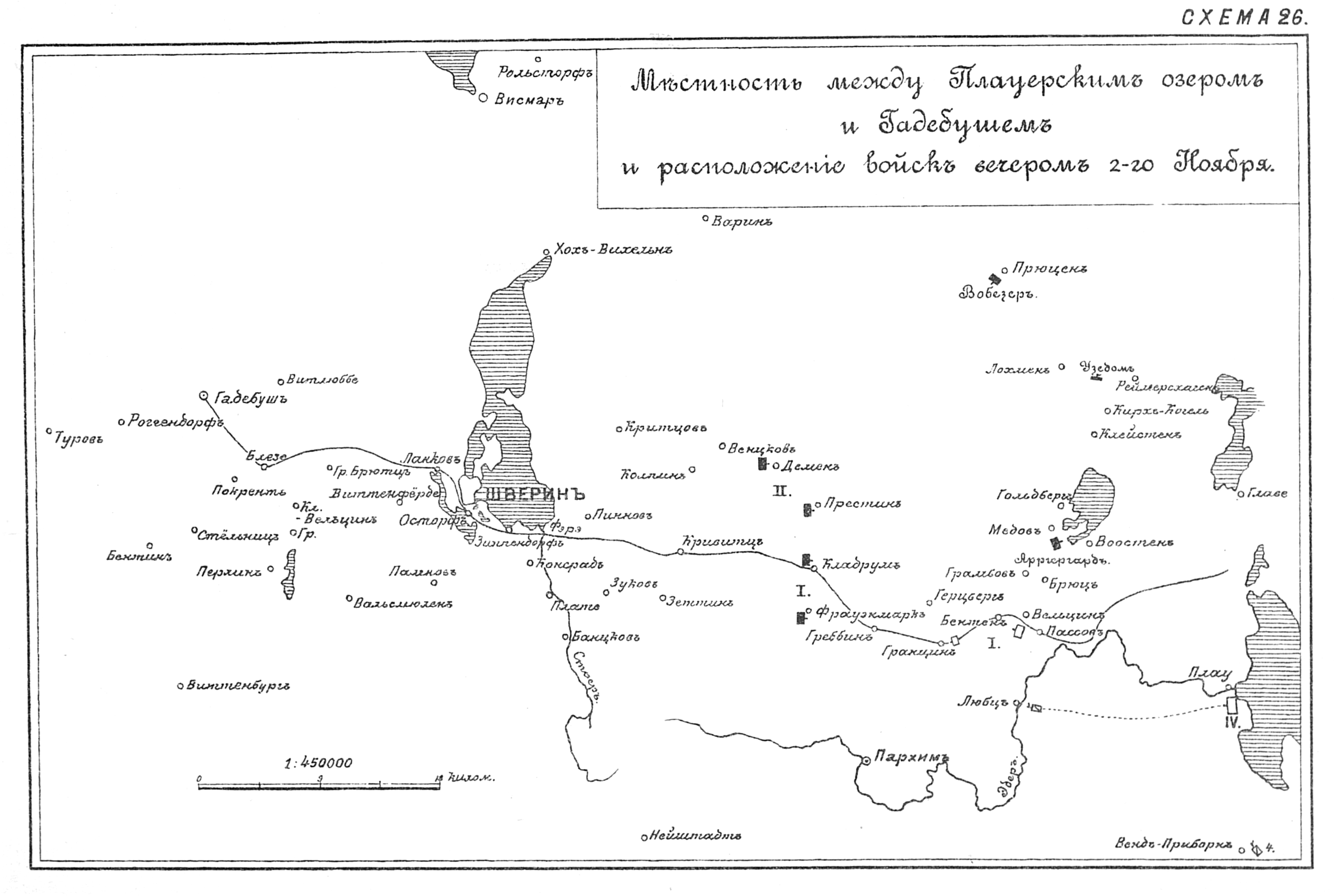 Местность между Плауерским озером и Гадебушем и расположение войск вечером 2 ноября
