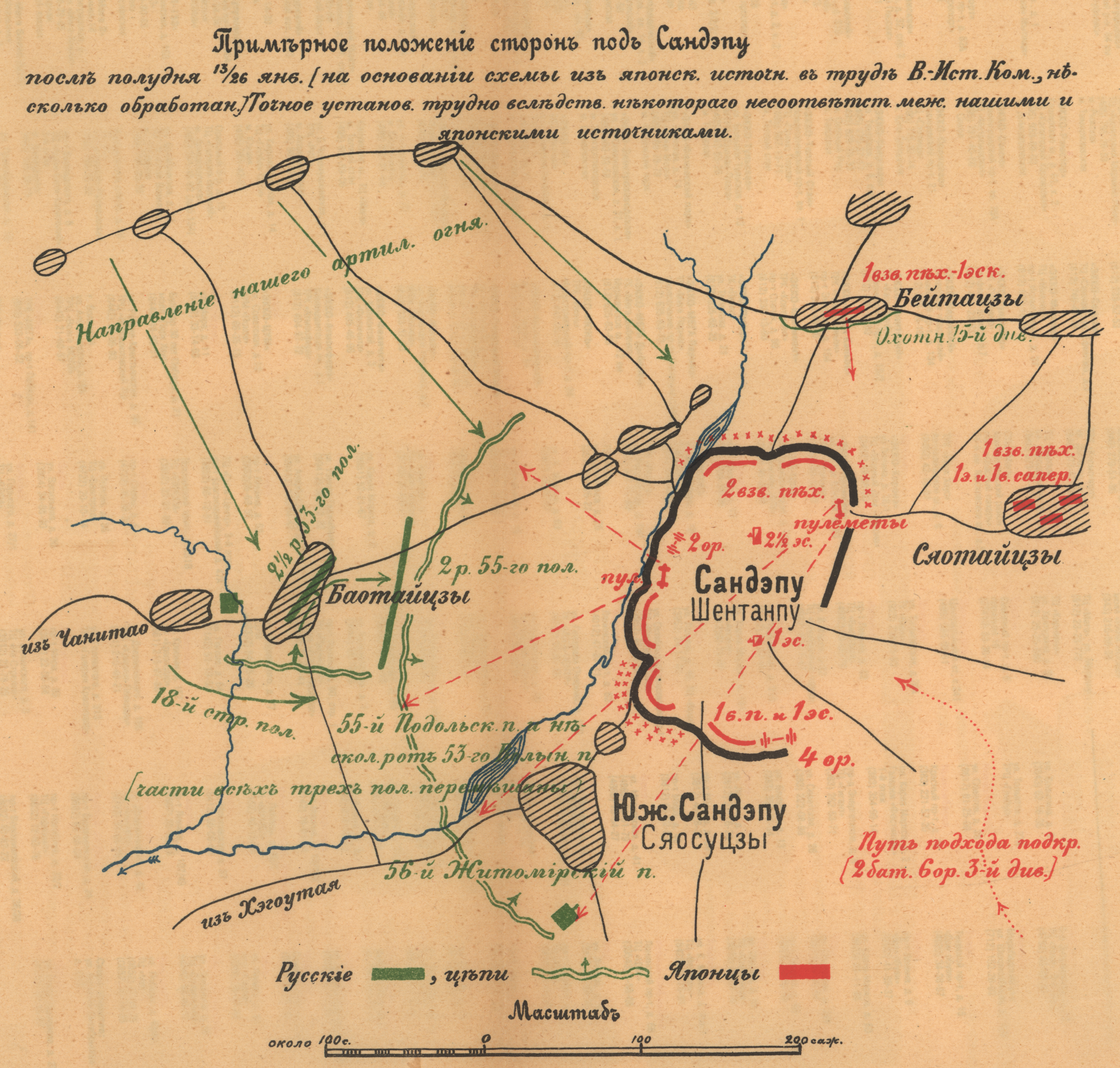 Примерное положение сторон под Сандэпу после полудня 13/26 января 1905 года (на основании японского источника в труде Военно-Исторической Комиссии). Точное положение установить трудно из-за несоответствия между источниками