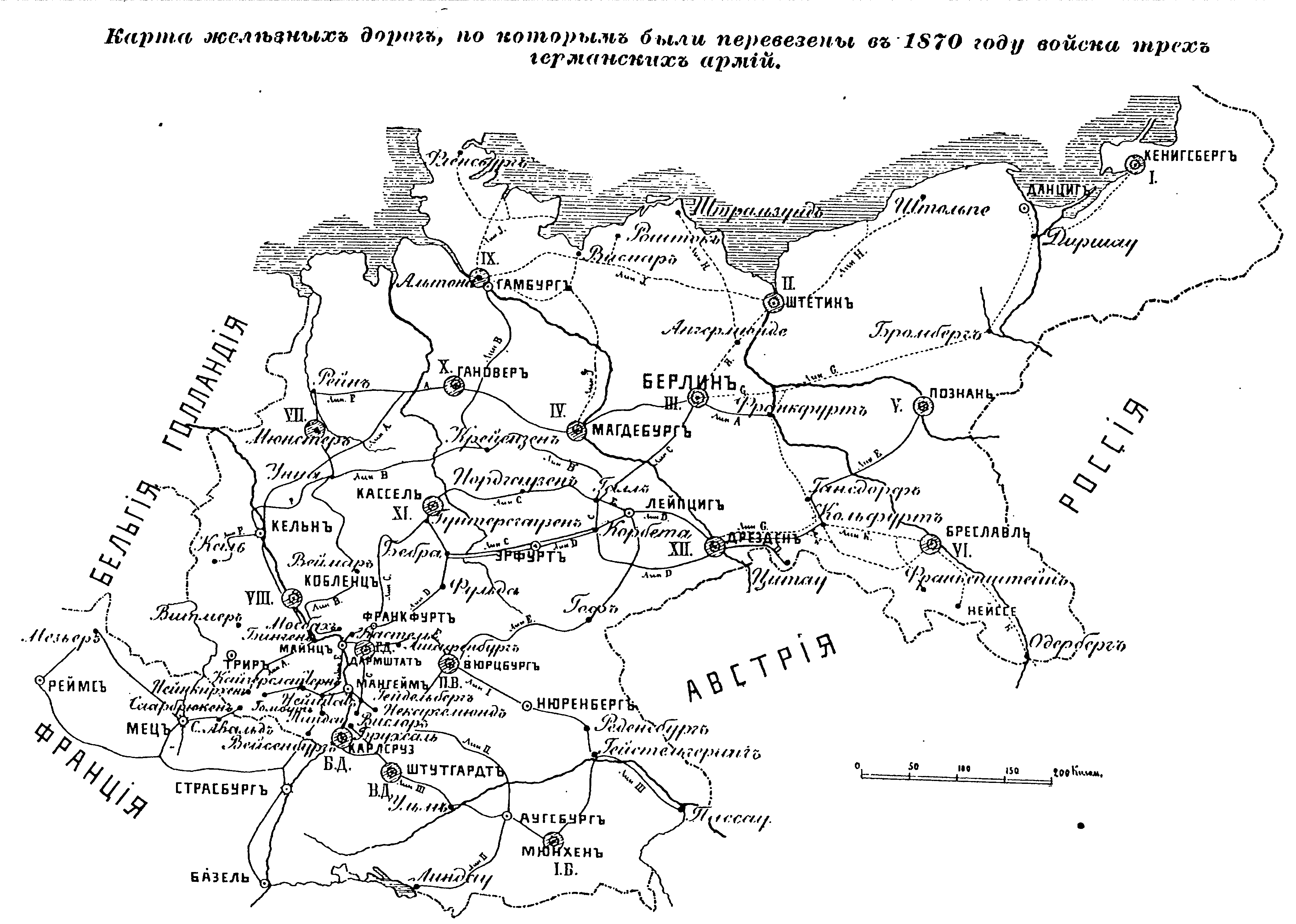 Карта железных дорог, по которым были перевезены в 1870 году войска трех германских армий.