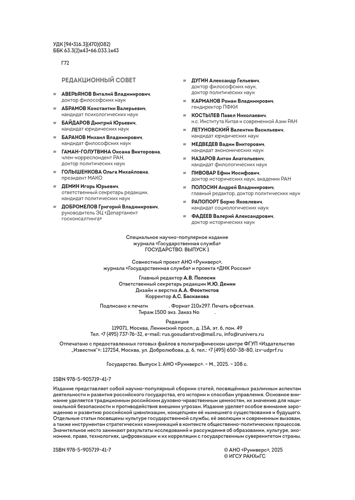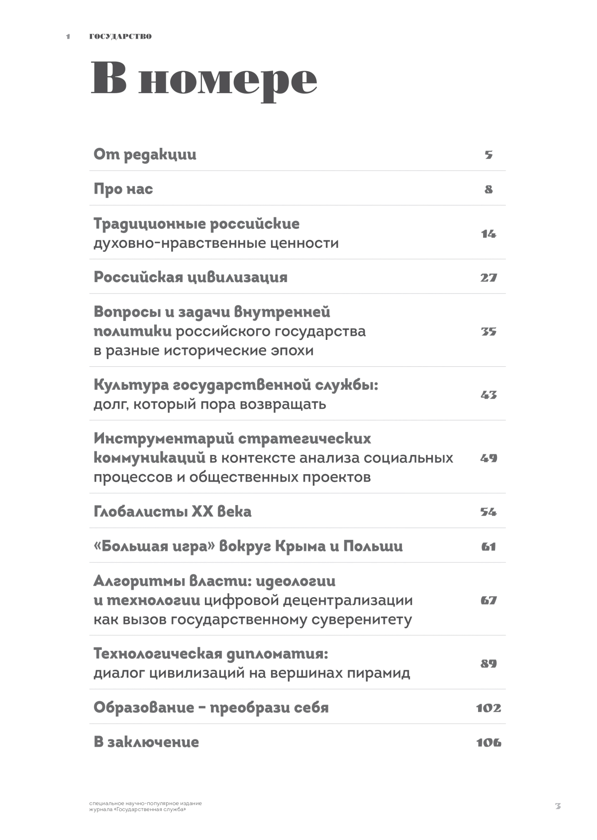 Издание представляет собой научно-популярный сборник статей, посвящённых различным аспектам деятельности и развития российского государства, его истории и способам управления. Основное внимание уделяется традиционным российским духовно-нравственным ценностям, их значению для национальной безопасности и противодействия внешним угрозам. Издание уделяет особое внимание зарождению и развитию российской цивилизации, концепциям её нынешнего существования и будущего. Отдельные статьи посвящены культуре государственной службы, её эволюции и современным вызовам, а также инструментам стратегических коммуникаций в контексте общественно-политических процессов. Значительное место занимают результаты исследований и рассуждения об образовании, культуре, экономике, праве, технологиях, цифровизации и их корреляции с государственным суверенитетом страны.