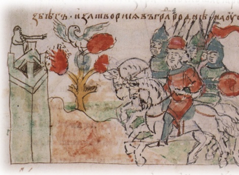 В год 6488 (980). Владимир вернулся в Новгород с варягами и сказал посадникам Ярополка: «Идите к брату моему и скажите ему: Владимир идет на тебя, готовься с ним биться». И сел в Новгороде.
