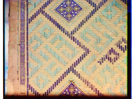 Самаркандская область. Самарканд. Образцы мозаичных стен в Шах-Зинде. Спарава внизу