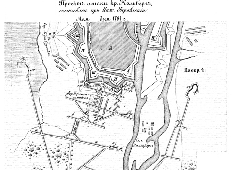 Осады крепостей. Изобр.1. План укрепленного лагеря при Кольберге, и атаки на него, произведенной русскими войсками в 1761 году