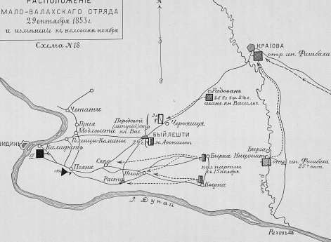 Русские войска 4 октября 1853 г. подвергли обстрелу турецкую крепость Исакча, затем 23 октября 1853 г., после переправы части турецкой армии на левый берег Дуная, предприняли попытку овладеть укреплениями турок при Ольтенице, но вынуждены были отступить. 25 декабря 1853 г. в сражение при Читате турки потерпели поражение, отступив к Калафату.