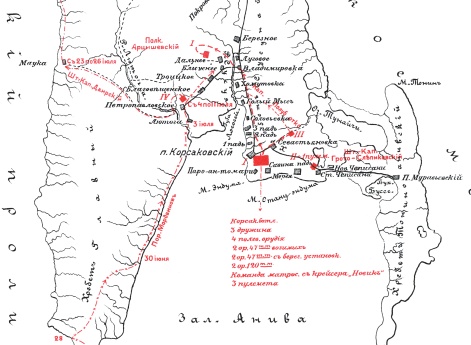Японские войска 24 июня 1905 г. совершили высадку крупных сил десанта у поста Корсаковский на о. Сахалин, которым противостояли слабо вооруженные пять партизанских отрядов. В ходе нескольких боестолкновений практически все партизанские отряды сдались.