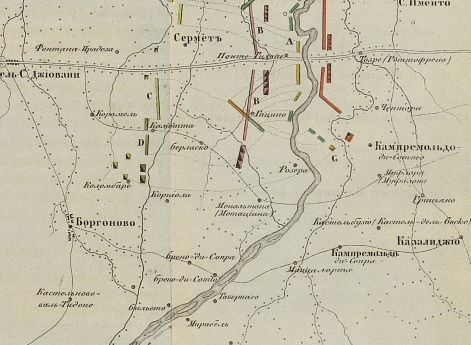 Русско-австрийский авангард атаковал французов, занимавших позицию на реке Тидоне у деревень Сармато и Медано, и к вечеру с прибытием главных сил заставил отступить