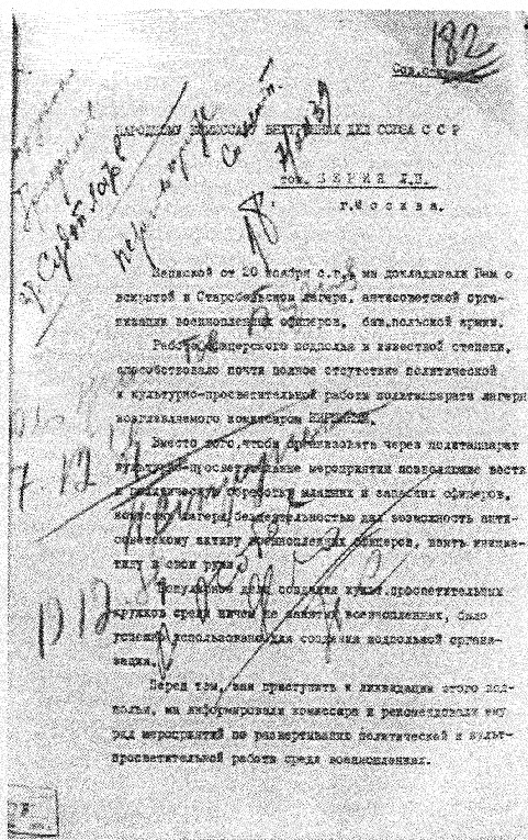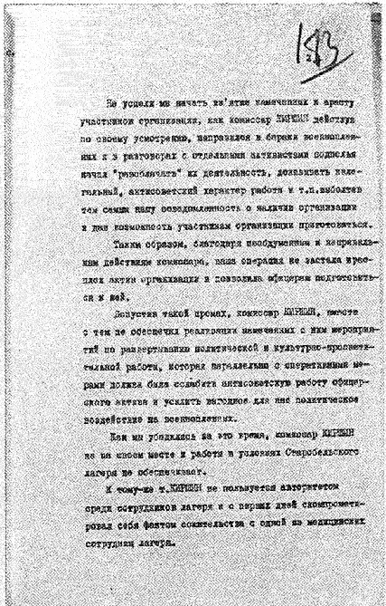 1939 год, 25 ноября Докладная записка оперативной группы НКВД СССР, командированной в Старобельский лагерь, Л. П. Берии о неудовлетворительной работе комиссара Киршина М. М., допустившего образование в лагере антисоветского офицерского подполья.