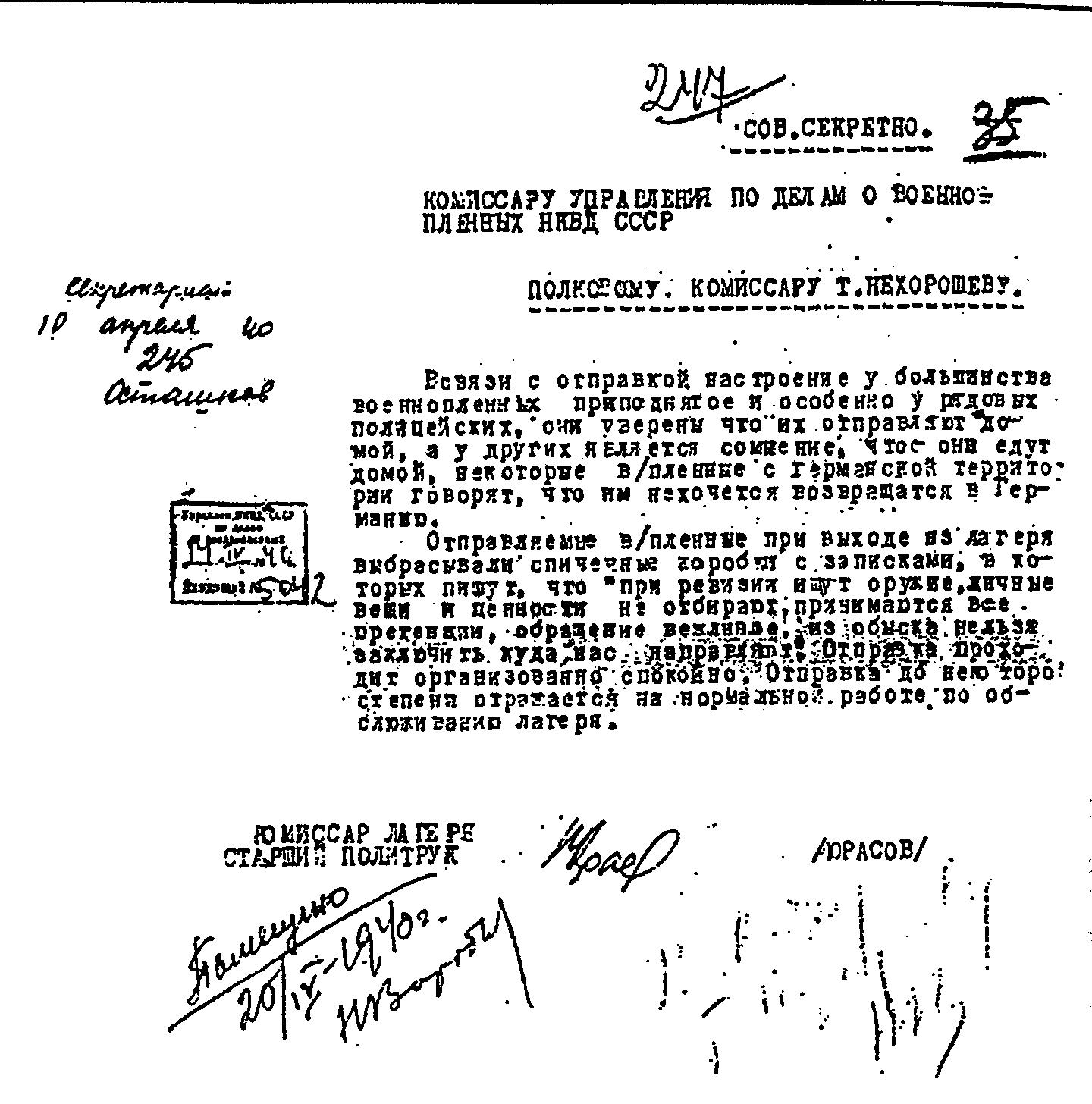 1940 год, 10 апреля Донесение политкомиссара Осташковского лагеря И. А. Юрасова С. В. Нехорошеву о настроениях военнопленных, отправляемых из лагеря.