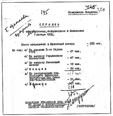 1940 год, не ранее 26 мая Справка начальника УПВ НКВД СССР о количестве военнопленных, переведенных их трёх спецлагерей в Юхновский лагерь, с разбивкой по основаниям их содержания.