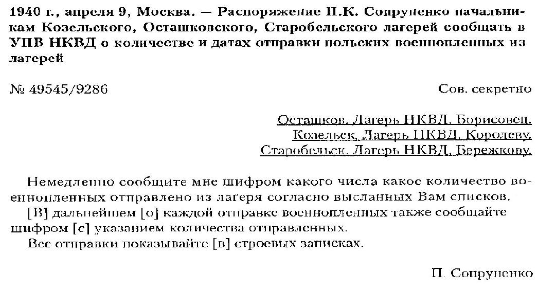1940 год, 9 апреля Распоряжение П. К. Сопруненко начальникам Козельского, Осташковского и Старобельского лагерей о необходимости шифрованных сообщений в Управление по делам военнопленных о количестве и датах отправления польских военнопленных из лагерей.
