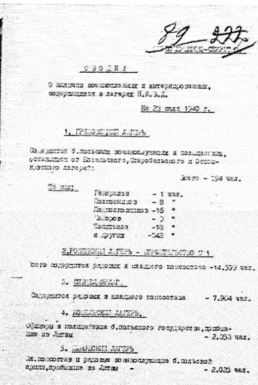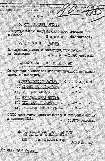 1940 год, 23 июля Сводка о наличии военнопленных и интернированных в лагерях НКВД СССР с разбивкой по лагерям.
