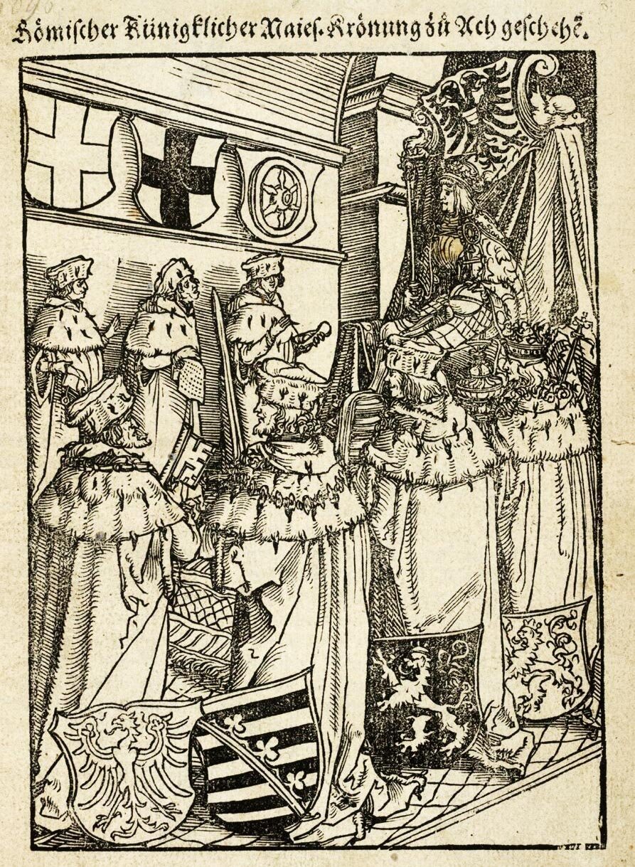 28 июня 1519 года. Коллегия германских курфюрстов во Франкфурте единогласно избрала королём Германии (официальный титул — король римлян) Карла V. 23 октября 1520 года Карл коронован в Ахене. При этом Карл V провозгласил себя и «избранным» императором Священной Римской империи, таким образом лишая папский престол прерогативы назначения и коронации императоров. ... Право избирать в Императоры издавна принадлежало семи владетельным особам, носившим имя электоров. Они были в то время следующие: Альберт Бранденбуржский, архиепископ Майнцский; Герман, граф Вейдский, архиепископ Кельнский; Рейхард Грейфенкляу, архиепископ Трирский; Людовик, король Богемский; Людовик, граф Пфальц-Рейнский; Фридрих, герцог Саксонский, и Иоаким I, маркиз Бранденбуржский. Невзирая на красноречивые доказательства, представленные в пользу Карла и Франциска их посланниками, и наперекор всем их стараниям, проискам и подаркам, электоры не забывали того правила, на котором, по мнению их, основывалось государственное учреждение Германии. У членов империи, составленной из владений, почти независимых, главный закон любви к отечеству состоял в том, чтобы ослаблять и ограничивать власть императора. Уже несколько веков не возводили на престол императорский ни одного могущественного государя, и этой благоразумной предосторожности многие знатные дома в Германии были обязаны своим блеском и независимостью. Избрание того, или другого из монархов-совместников было бы грубым нарушением древнего благотворного правила; империя получила бы не главу, а повелителя; электоры же перешли бы из равных в подданные. В этих мыслях все они обратили свои взоры на Фридриха, герцога Саксонского, за высокие добродетели и способности проименованного Мудрым, и единогласно предложили ему императорскую корону. Но вещь, которой так ревностно домогались самые могущественные государи того времени, не ослепила его; подумав немного, он отказался от нее с удивительным великодушием и бескорыстием. Он заметил, что нет ничего неосновательнее упорной привязанности к правилу, которое хотя и может быть благоразумно и справедливо во многих случаях, но не простирается на все вообще. «Во времена мирные, – сказал он, – мы ищем Императора, которыми был бы не в состоянии посягать на наши права; времена опасности требуют такого, которой был бы способен защитить нас. Турецкие войска, предводимые храбрым и победоносным монархом, уже собираются; уже они готовы броситься на Германию с яростью, неизвестною в прежние века. В новых обстоятельствах нужны новые меры. Императорский скипетр должно вверить руке, более мощной, нежели моя, нежели рука всякого германского государя. Ни по владениям, ни по доходам, ни по власти, мы не можем противостать грозному Селиму. В этой крайности должно прибегнуть к одному из монархов-соперников. Каждый из них в состоянии вооружить войско, достаточное для нашей защиты. Но испанский король – германского происхождения; он член и князь империи по наследству, которое досталось ему от его деда; он владеет землями, которые простираются вдоль границы неприятельской: поэтому и требование его предпочтительнее в моих глазах притязания государя, чуждого нашему языку, нашей крови, нашему отечеству. Я подаю голос в пользу Короля Карла». Это мнение, внушенное необыкновенным великодушием и осно