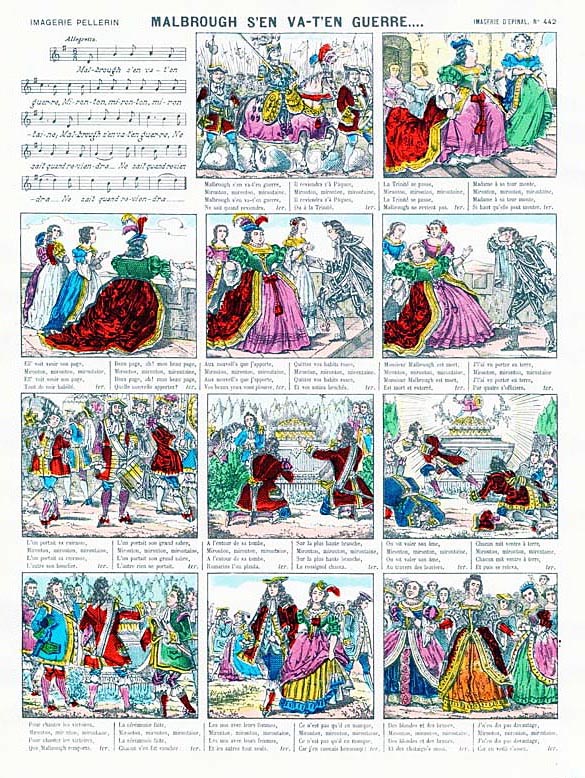1709 год.Французские солдаты сочиняют знаменитую песенку «Мальбрук в поход собрался». Во время войны за испанское наследство во французском стане среди солдат распространился ложный слух о том, что убит виновник их многочисленных неудач, командующий английскими войсками герцог Мальборо (Marlborough) , имя которого французы произносили как «Мальбрук». На радостях солдаты стали напевать на незатейливый мотив песенку о злосчастном полководце, начинавшуюся словами: «Мальбрук в поход поехал, Миронтон, миронтон, миронтэн». В песне рассказывалось о том, как жена Мальбрука ждёт своего мужа, ушедшего на войну. Прошло уже много времени, а Мальбрук так и не вернулся ни к Пасхе, ни к Троице. Внезапно у ворот замка появляется паж с вестью о гибели Мальбрука и потешным описанием его похорон. В действительности Джон Черчилль, 1-й герцог Мальборо, был жив и невредим и скончался своей смертью в 1722 году. Новый взлёт популярности песни о Мальбруке случился в конце XVIII века, когда композитор Мартин-и-Солер переработал её для своей оперы Una cosa rara (1786), где мотив песенки, явно записанный композитором на слух, приобрёл новые черты. Опера имела огромный успех и была показана 78 раз. Моцарт процитировал музыку Мартина-и-Солера в ансамбле «O quanto in sì bel giubilo» в финале «Дон Жуана» (1787), тем самым подкрепив новую популярность мотива песни о Мальбруке. Распространению «классического варианта» в немалой степени способствовала королева Мария-Антуанетта. Песенку о Мальбруке пела её сыну привезённая из глухой провинции кормилица, баюкая дофина. Вскоре колыбельную о Мальбруке пели и королева, и король Людовик XVI; затем модную песенку подхватили придворные, а за ними и буржуазные круги. Французская песня о Мальбруке некоторое время пользовалась популярностью и в России. Во время Отечественной войны 1812 года была переведена на русский язык. В солдатском обиходе слова песни были изменены, приобретя комические и непристойные подробности. Имя полководца Мальбрука при этом сохранилось, но под ним безусловно подразумевали Наполеона.