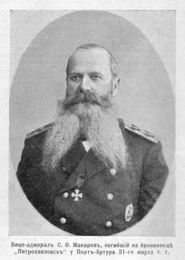 На внешнем рейде к командующему присоединились броненосцы “Победа” и “Пересвет”. После перестроения Макаров на “Петропавловске” вновь повернул навстречу японским кораблям с намерениями дать им бой под прикрытием береговых батарей. Но в 9 часов 43 минуты в 2 милях от полуострова Тигровый Хвост “Петропавловск” наскочил на минную банку – несколько мин, объединенных между собой. Раздался взрыв, затем другой, более сильный - это сдетонировал боезапас главного калибра носовой башни и носовой минный погреб, разломив корабль пополам.. Броненосец накренился на правый борт и носом ушел под воду. Все это произошло в течение 2 минут. Спасти удалось только 80 человек, в том числе командира корабля капитана I ранга В.М. Яковлева, великого князя Кирилла Владимировича и 5 офицеров. В числе погибших на “Петропавловске” 650-и человек были: вице-адмирал С.О. Макаров, начальник штаба контр-адмирал М.П. Молас, флаг-офицер эскадры капитан 2 ранга М.П. Васильев, флагманский артиллерийский офицер капитан 2 ранга А.К. Мякишев, флагманский минный офицер капитан 2 ранга К. Ф. Шульц, только что прибывший в Порт-Артур и назначенный командиром “Пересвета” капитан 2 ранга Н.А. Кроун, флагманский штурман А.А. Коробицын, начальник военного отдела штаба полковник А.П. Агапеев и друг С.О. Макарова знаменитый художник-баталист В.В. Верещагин.