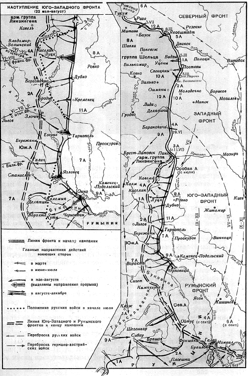 Значение Брусиловского прорыва в ходе первой мировой войны огромно. Он показал, что после исключительных неудач 1915 года, после потери огромной территории русская армия не только может еще сопротивляться, но и наносить своему противнику страшные удары. Потери австро-германцев во время Брусиловского прорыва, длившегося до конца октября, составляли убитыми, ранеными и пленными до 1,5 миллиона человек. Русским достались 581 орудие, 1795 пулеметов, 448 бомбометов и минометов, огромное количество военного имущества. Фронт был прорван на протяжении 350 километров, а глубина прорыва доходила до 70 — 120 километров. Русские войска вступили в Северную Буковину и овладели Черновицами.