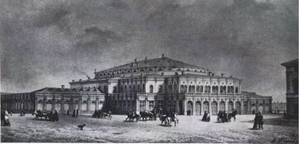 29 января 1849 года в здании, выстроенном напротив Большого театра по проекту архитектора Альберта Кавоса, праздничным конным представлением открылся Конный цирк. Он был спроектирован так, что мог использоваться и как театральное помещение. Ровно через десять лет цирк сгорел. Восстановленное здание предназначалось только для музыкальных спектаклей. Сюда переехала русская оперная, а затем, в сезоне 1885-1886 годов, и петербургская балетная труппа.