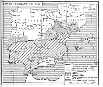 Таким образом, во второй половине XIII в. большую часть Пиренейского полуострова занимали два государства. Одним из них было королевство Арагонское, которому принадлежали восточные области полуострова и побережье Средиземного моря, а другим — Кастильское королевство, простиравшееся с севера на юг от берегов Бискайского залива до Атлантического океана и Гибралтарского пролива и занимавшее всю центральную часть полуострова. В западной части Пиренейского полуострова сложилось самостоятельное королевство Португалия (1143 г.). Два государства, из соединения которых составилась впоследствии Испания, т. е. Кастилия и Арагон, оттеснили мавров так далеко к югу, что за ними осталась лишь небольшая область вокруг Гранады».