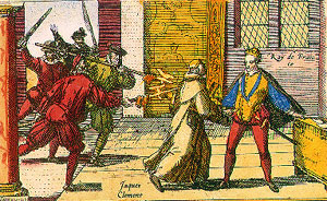 В 1589 году монахом-фанатиком был зарезан король Франции Генрих III. «…в середине 80-х гг. обстановка во Франции опять обострилась до крайности. В 1584 г. умер младший брат короля, герцог Анжуйский. Сам Генрих не имел наследников. Династию Валуа в ближайшие годы ожидало полное вырождение, а ближайшим наследником престола был глава гугенотов Генрих Наваррский. Перед лицом этой угрозы лигисты возобновили свою деятельность. Гизы вступили в союз с Испанией и провозгласили наследником престола ка...
