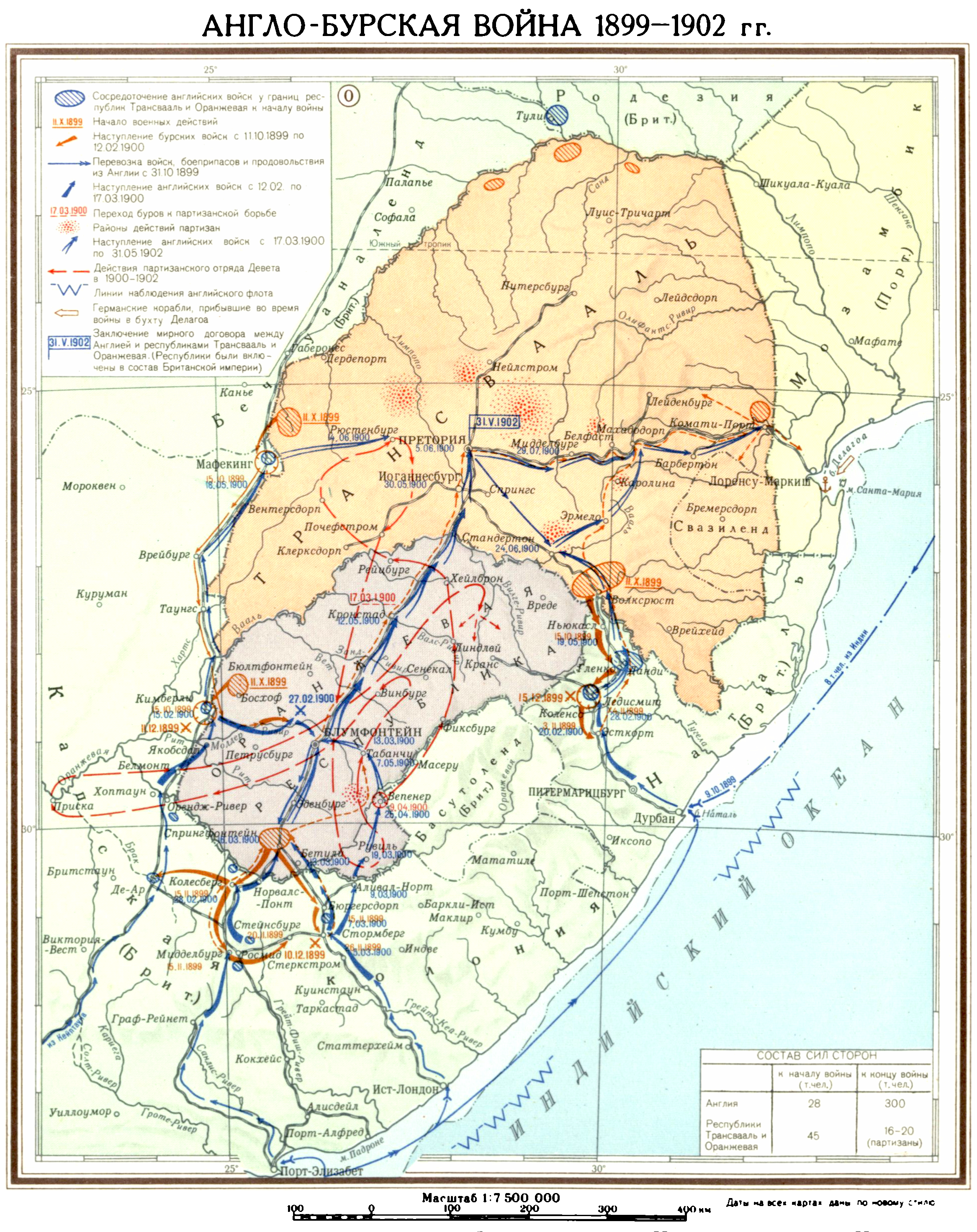 После овладения Англией в 1815 г. Капской землей, населенной по преимуществу голландскими выходцами — бурами, возникло недовольство последних англ. управлением. Началось массовое переселение буров на север, в Наталь и за р. Оранжевую, но Англия принудила переселенцев и здесь признать свою верховн. власть. В 1848 г. часть буров ушла еще дальше на север и, образовав здесь в 1852 г. Трансваальскую республику, сохранила свою независимость до 1877 г., когда республика, путем дальнейшего распространения англ. влияния, вошла в состав англ. владений. Буры отнеслись к этому безучастно, тем более, что Англия обещала республике широкую автономию. Однако, эти обещания не были исполнены; англичанами принимались все меры к закреплению за собой новых владений. Начавшиеся вследствие этого недоразумения в 1880 г. перешли к открытому сопротивлению со стороны буров. Удачные их действия в боях при Венгс-кэке и Маюбе привели в 1881 г. к соглашению, по которому Трансвааль, признавши верховн. права Англии, получил внутрен. автономию; а затем своей осторожной и мудрой политикой республика добилась того, что Лондонская конвенция 1884 г. свела почти к нулю англ. захват 1877 г. Между тем, открытие в 80-х гг. в Трансваале золотых приисков дало сильный толчок экономич. развитию страны и вызвало наплыв иностранцев (уитлендеров), а также прилив иностранных капиталов. С этих пор Трансвааль приобрел для Англии большую экономическую ценность, а по утверждении англ. влияния в Египте — и политическое значение; Англии представилась возможность захватить в сферу своего влияния весь материк Африки, от Каира до Капштадта.