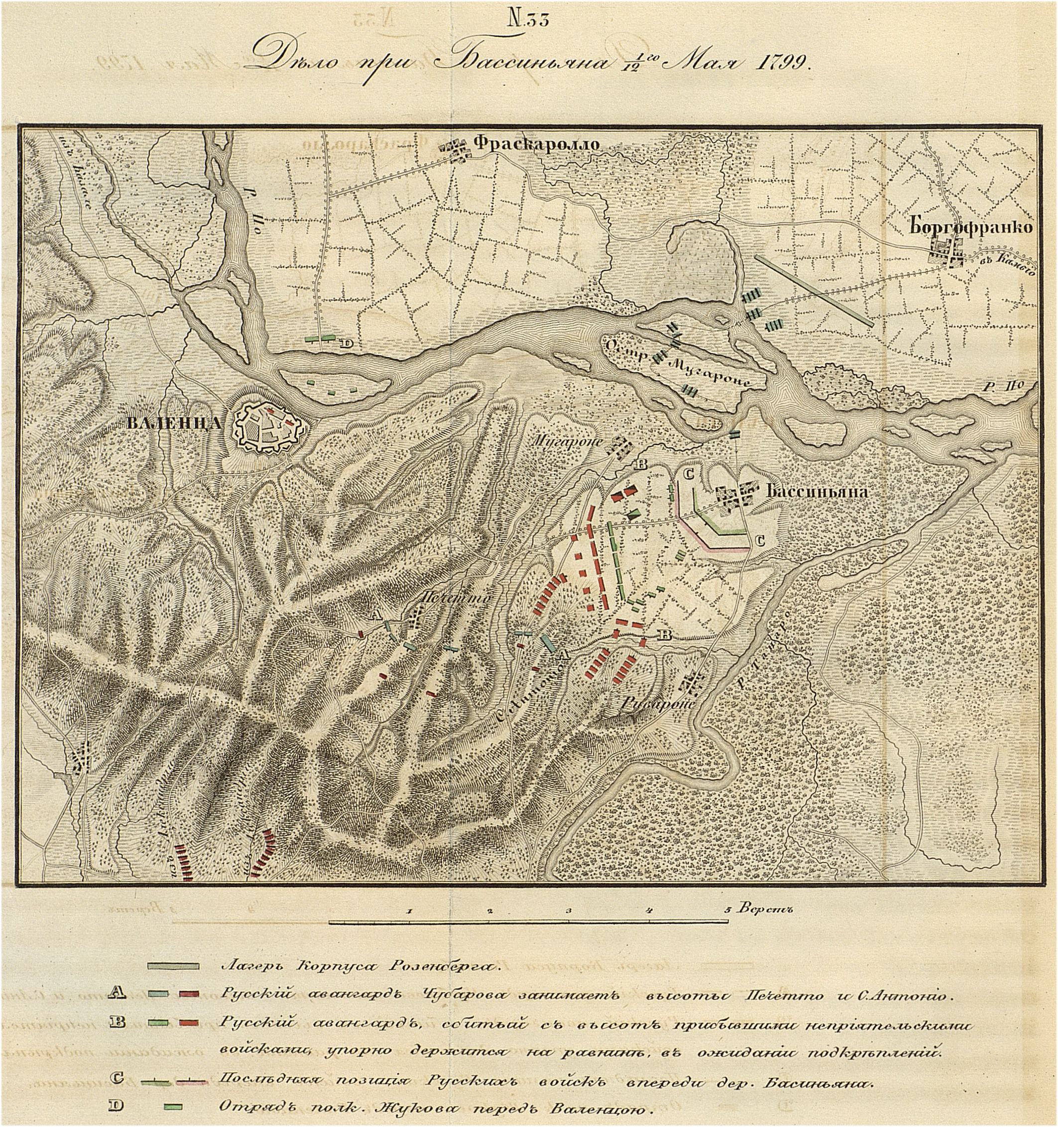 Пехота неприятельская, спустившись с высот, старалась охватить и левое крыло Русских войск. Однакож при всем своем перевесе в силах, Французы долго не могли одолеть упорной стойкости нашей пехоты: самые смелые атаки их были отражаемы; одно отдельное строение переходило несколько раз из рук в руки... В то время, как тут кипел самый отчаянный бой, вдруг на горах показались новые колонны неприятельские: — то были войска Виктора, пришедшие от Александрии. В такое критическое мгновение, генерал Милорадович, в голове двух рот, с правого крыла бросается в ту сторону, где угрожает большая опасность; взяв в руки знамя, он сам устремляется вперед; еще раз отбивает атаку неприятельскую... Но силы уже слишком неравны: Русские войска, сражавшиеся 8 часов сряду, не получая более подкреплений, должны наконец отступать: однакож они заняли еще позицию пред Бассиньяна и тут упорно держались до наступления ночи, отражая все неприятельские атаки.