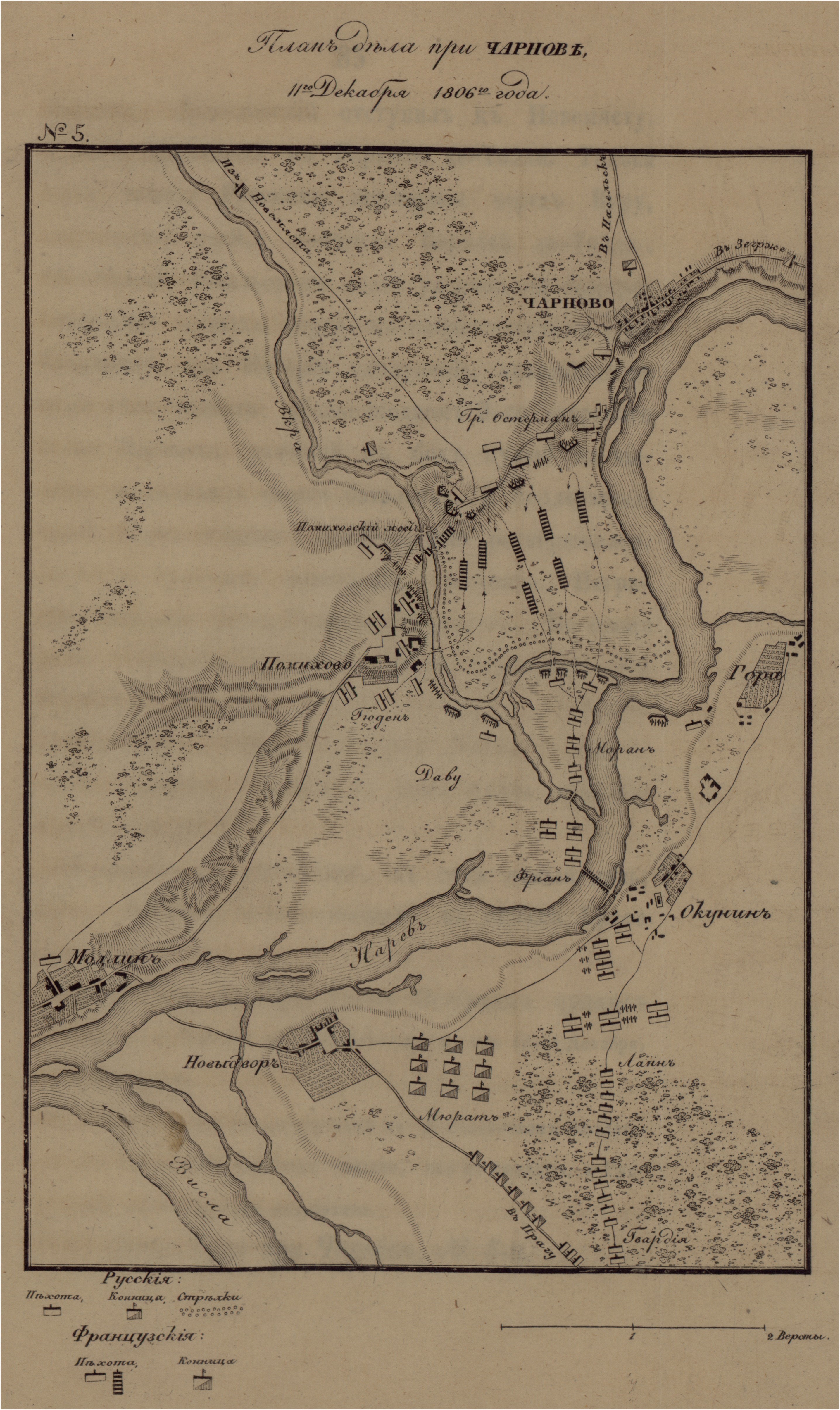 Атаку назначил Наполеон произвести впотьмах, приказывая начать стрельбу из пушек через час после того, когда увидят пожар в Помихове. В четыре часа по полудни Французы зажгли Помихово. Уже с утра заметив скопление против него неприятелей и делаемые ими передвижения, граф Остерман догадался, что огонь вдруг запылавшего селения был сигналом какого-либо замышляемого Французами предприятия. Он приготовился к бою, не зная о предстоявшей ему чести — первому из Русских генералов померяться с Наполеоном во второй войн его с Александром. Как будто нарочно, для встречи великого полководца, отряд графа Остермана был во всей парадной форме, ибо с утра ожидали приезда в Чарново Фельдмаршала Каменского. Через час после пожара в Помихове, французы начали стрелять из пушек. Когда смерклось, они двинулись вперед с острова и с правого берега Вкры, по мостам, в лодках и на паромах. Генерал-майор Граф Ламберт, с шестью ротами егерских полков, 4-го, Фролова, и 20-го, Бистрома, удерживал неприятеля, но вскоре Граф Остерман приказал ему отступить, сберегая егерей от огня многочисленных неприятелей…