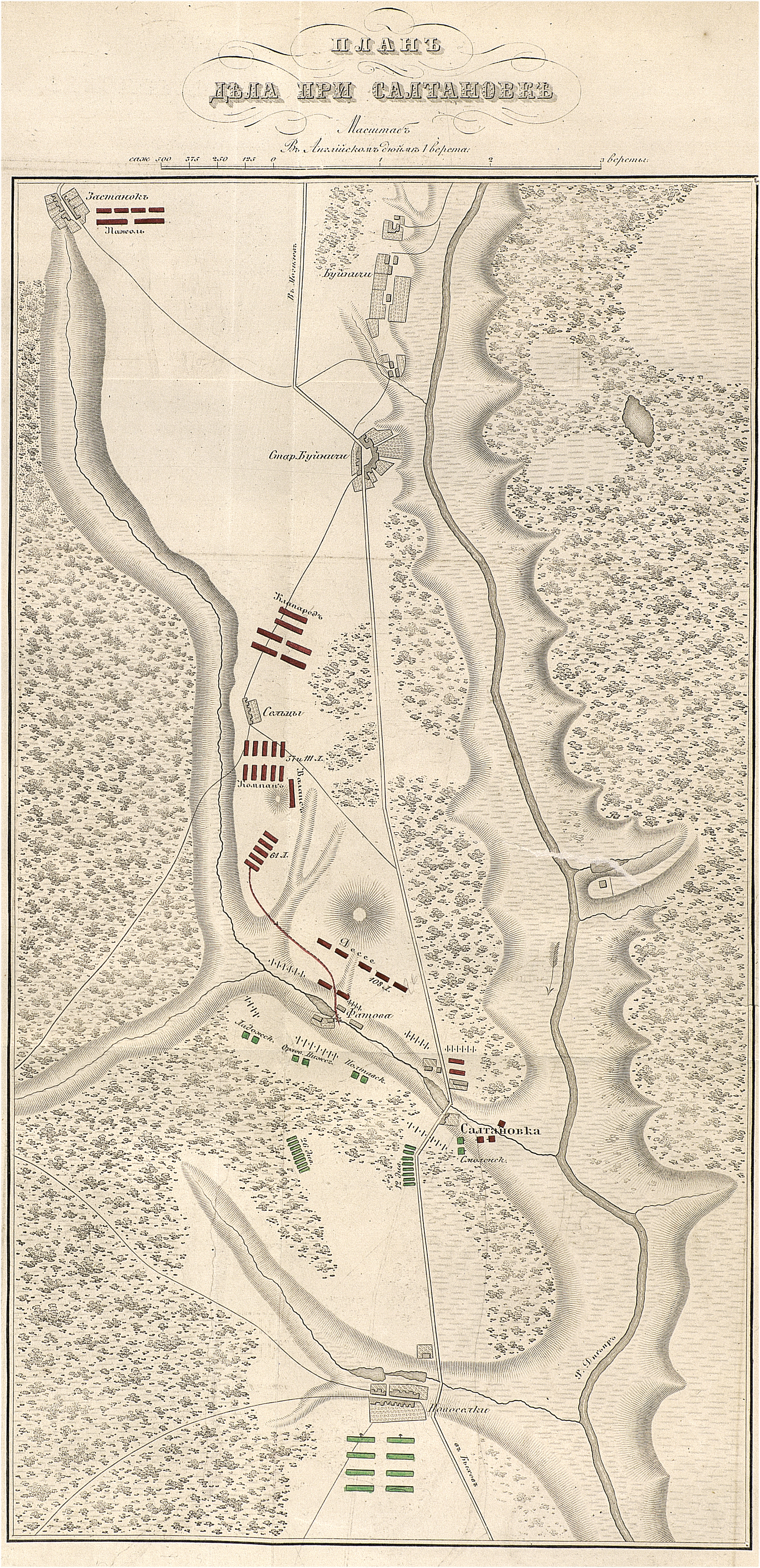 10-го (22-го) июля, передовые войска Раевского, оттеснив неприятельский авангард, расположенный у деревни Дашковки, заставили его отойти на позицию у Салтановки…