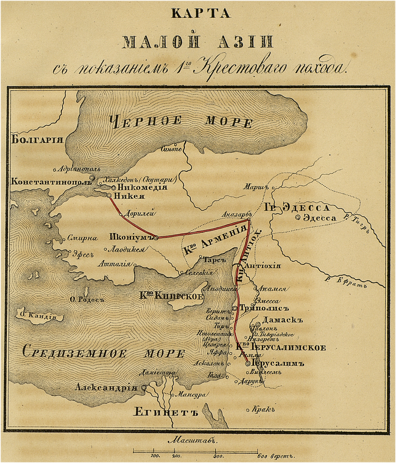 Военные действия Крестоносцев начались осадою Никеи, города принадлежавшего к султанству Иконийскому, основанному Килидж-Арсланом (меченосным львом), по смерти Малека-Шаха, внука Тогрул-Бегова , в 1092 году. В продолжение этой осады, Греки открыли тайно переговоры с жителями города и уговорили их сдаться императору Алексию; греческие войска скрытно вошли в город и водрузили на стенах его свои знамена к удивлению и досаде Крестоносцев, которые явно были обмануты своими союзниками. Но не желая нарушить данного обета враждою с христианами, воины Готфрида, спустя девять дней по взятии Никеи, выступили в дальнейший поход; армия их двинулась двумя колоннами, которые следовали без всякой связи между собою. Правая колонна, под начальством Готфрида, Раймунда Тулузского, епископа Адемара и графов Вермандуаскаго и Фландрскаго, двигалась чрез Дорилейскую равнину, между тем как левая, под предводительством Боэмунда Тарентскаго, Танкреда, Роберта Нормандийскаго, и проч. вступила в долину Горгони и 30-го июня расположилась там на ночлег при небольшой речке