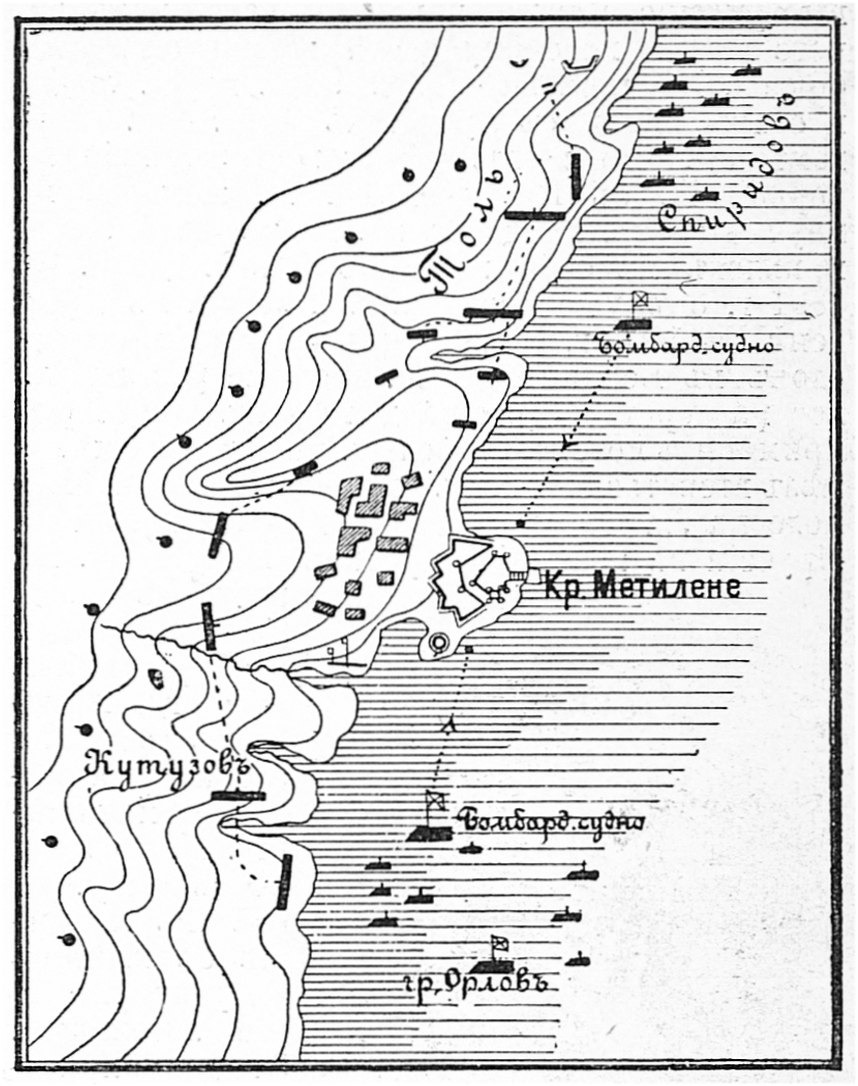 В начале октября гр. Орлов двинулся с большею частью своего флота к острову Метилене с целью уничтожить находившиеся там турецкие магазины и верфь, прикрытые крепостью...