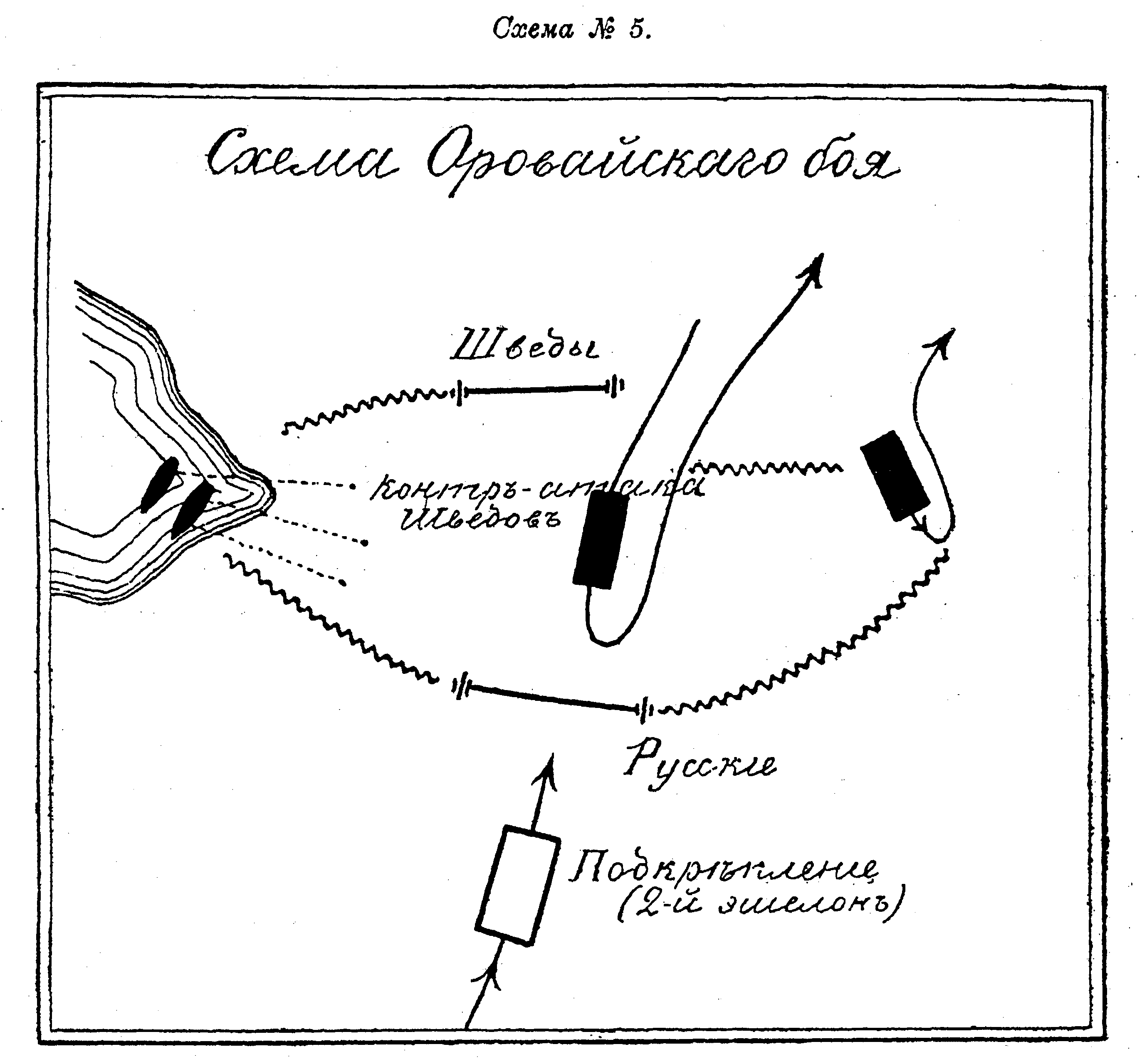 Контратака шведов была направлена как раз в надлежащем направлении: сосредоточив огонь своих батарей на участке нашего боевого порядка, ближайшем к большой дороге, шведы ударили частью сил на наше обходившее правое крыло, а главную массу резервов бросили на центр нашего расположения, поддерживаемые, кроме артиллерийского, еще анфиладными огнем канонерок из бухты.