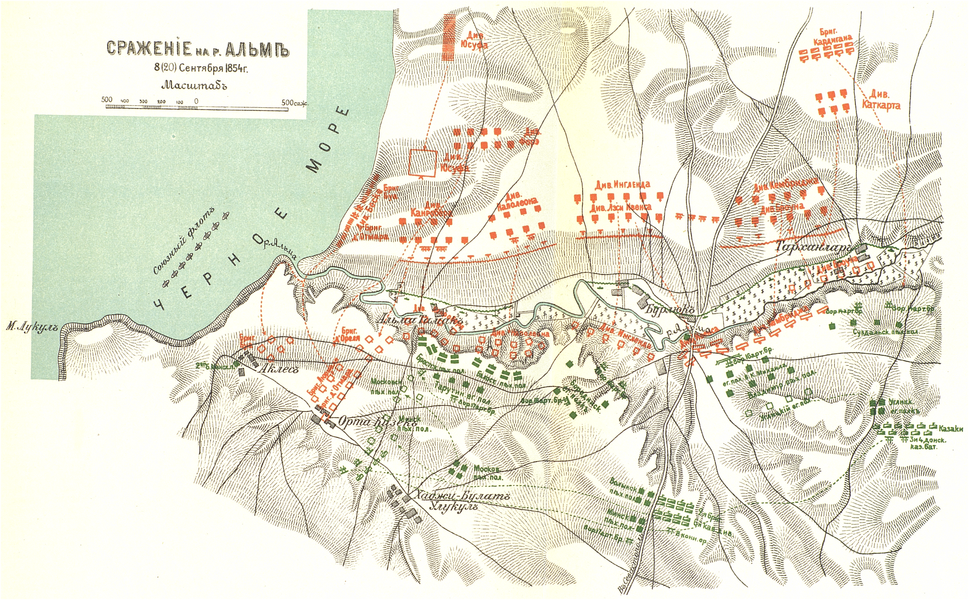 Выгоды Альминской позиции, преграждавшей неприятелю доступ к Севастополю, были весьма существенными. Однако, позиция представляла также и крупные невыгоды. Не было принято мер к ее укреплению. Дороги и тропинки, ведущие из долины на лев. фланге, не только не были испорчены, но даже и наблюдаемы…