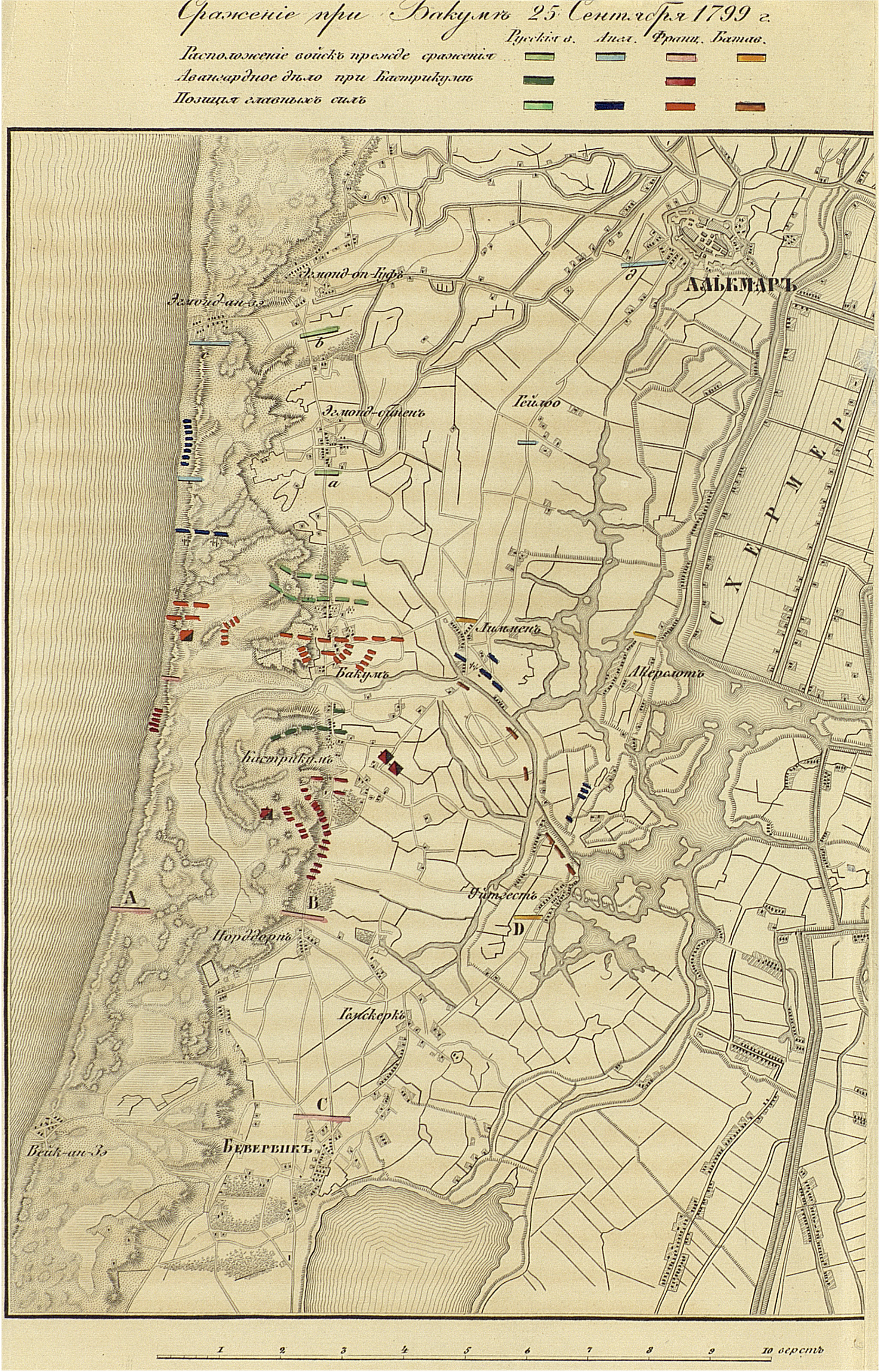 …Чтобы облегчить атаку неприятельской позиции, Герцог Иоркский решился 25-го числа выдвинуть передовые войска свои и занять деревни Бакум, Лиммен и Акерслот. С этою целью дано было приказание Русскому авангарду Седморадского двинуться на деревню Бакум; генералу Аберкромби — наступать вдоль морского берега, Дёндасу — к деревням, Лиммен и Акерслот