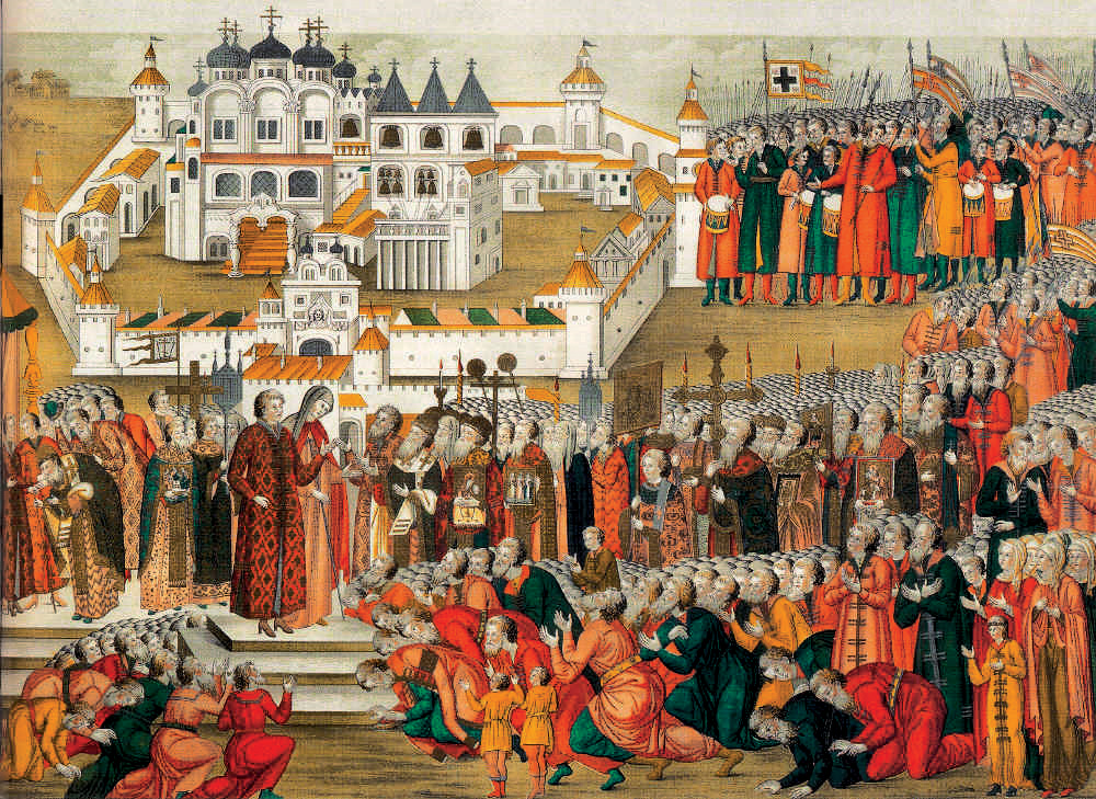 В назначенный день [2 ноября 1618 г.], у Тверских ворот явились для переговоров уполномоченные: с Русской стороны Феодор Михайлович Шереметьев, Данила Иванович Мезецкий; Артемий Васильевич Измайлов, Дьяк Иван Иванович Болотников и писарь Сумов. Конвой их состоял из 2 тысяч человек, которые стояли по обеим сторонам стены, как будто пред боем. С Польской стороны были: Епископ Каменецкий, Адам Новодворский, Константин Плихша, Канцлер ЛевСапега и Яков Собеский; при них находилось конвоя 500 человек пеших и конных. Бояре первые приветствовали Польских Уполномоченных, а потом от них получили взаимное приветствие. Сии последние предлагали сойти с лошадей, но Русские ответствовали, что им “удобнее будет вести переговоры на лошадях”. Потом Шереметев выехал несколько шагов вперед, и, выговорив весь Царский титул, сказал, что мы прибыли сюда “с воли Царя и Великого Князя для переговоров о мире; но предупреждаем вас, если будете называть Владислава Царем, то переговоры немедленно прекратятся. Каково бы ни было избрание его на престол, но мы о сем давно забыли. Вручив скипетр Царю Михаилу, мы не отступимся от него, хотя бы то стоило нам и потери жизни и имущества. Впрочем мы не жаждем мира, и находимся здесь потомy только, что вы первые домогались оного .” “Не опровергаем того, что Владислав был избран нами добровольно; и мы ему присягнули как Царю и воссылали к небу горячие мольбы о сохранении и здравии его. Имя его употребляемо было на всех бумагах, печатях Государственных, золотой и серебряной монете. Столица, Великокняжеская держава, корона, драгоценные сокровища, все украшение, отдано было в руки Гетману Жолкевскому до прибытия Царя, коего мы с нетерпением ожидали: но он столь долгое время не явился среди нас; отправленные за ним послы, вопреки прав народных, взяты в неволю. Король ваш старается не о сыне, но собственно о себе: врученный Владиславу скипетр он хотел удержать собственно для себя. Может быть, для вас это тайна, но знайте, что Сигизмунд чрез поверенных своих, старался склонить наших Бояр, чтобы они отдали скипетр ему, а не сыну его, еще несовершеннолетнему и не опытному. Содрогается душа при одном воспоминании о начале сих войн и об ужасах, с каковыми они производились. Для чего было к нам приводить Лже-Димитриев? Для чего мешаться в наши домашние споры? Вести наступательную войну со свирепостью, которая может быть едва простительна только при отражении несправедливого наезда! Развратные ваши солдаты не знали мер в оскорблениях и в расточительстве: отнявши все, что только находилось в доме, они мучениями и истязаниями добивались ещезолота, серебра или других драгоценных вещей. Так мужья должны были смотреть на насилие своих жен, а матери на осквернение своих несчастных дочерей! У нас живо еще в памяти разврат и своевольство ваше. Столица была свидетелем, когда днем, при солнечном блеске, и ночью, при свете пламенеющих факелов, солдаты, разгоряченные напитками, рыскали по улицам, нанося безоружным жителям побои, раны и бесчестье. Вы раздражали наши сердца обиднейшим презрением: никогда соотечественник ваш не был вами иначе называем, как собакою-москалем, злодеем, и изменником. Вы не могли воздержать рук даже от Божиих храмов. Столица вами обращена в пепел; сокровища, долго нашими Царями собираемые, расхищены вами; Государство наше огн