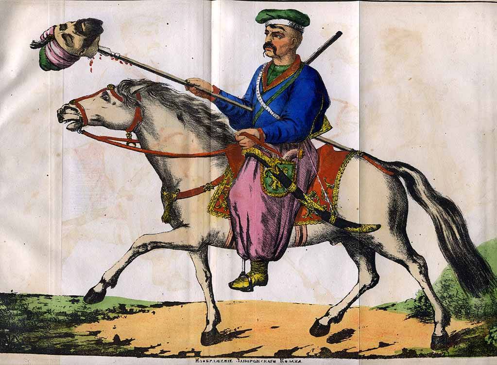 Запорожский казак с головой турка на конце пики. Раскрашенная гравюра на меди. Иллюстрация из книги: Ригельман А. Летописное повествование о Малой России и ее народе и о казаках вообще. М., 1847. Рис. 22 Фрагмент. Смотреть полностью.